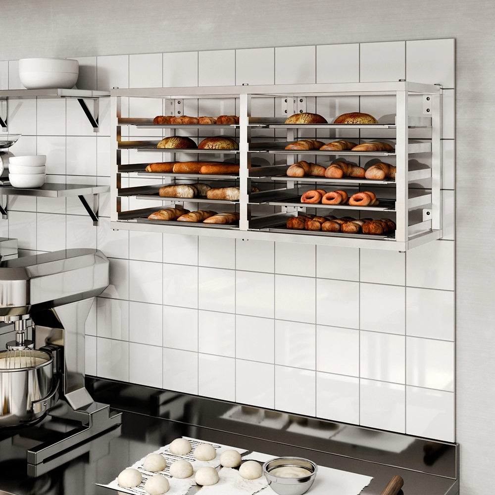 This sleek, professional pan rack is not only practical but also adds a polished look to your kitchen environment. Whether you’re running a bakery, restaurant, or catering service, this wall-mounted rack enhances organization, improves workflow, and keeps your kitchen running smoothly.