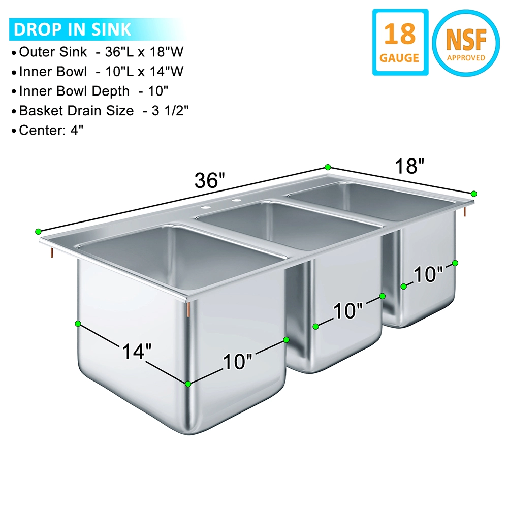 Introducing the 10″ X 14″ X 10″ Stainless Steel Three Compartment Drop-In Sink – the ultimate solution for maximizing efficiency and organization in any kitchen or workspace. Expertly crafted from 18GA/304 stainless steel, this sink promises exceptional durability, corrosion resistance, and easy maintenance, all while offering a sleek, professional look that enhances any environment.