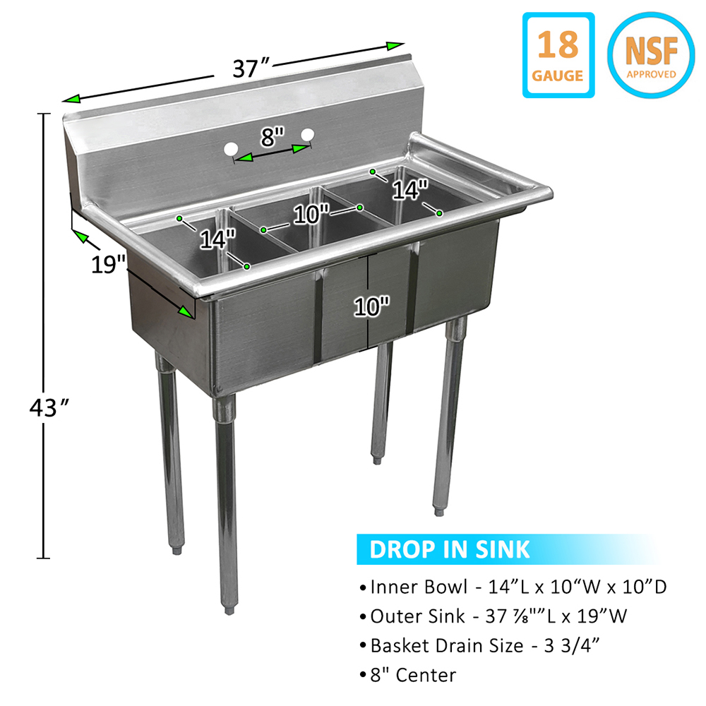 The 10″ x 14″ x 10″ Three-Compartment Sink is a compact and durable solution for efficient cleaning and prep tasks. Made from 18GA/304 stainless steel, ensures long-lasting use. The three compartments allow for separate washing, rinsing, and sanitizing, making it ideal for small kitchens, bars, or utility spaces. Its compact design fits tight spaces while maintaining functionality. Easy to clean and maintain, this sink is a reliable choice for residential and commercial use.