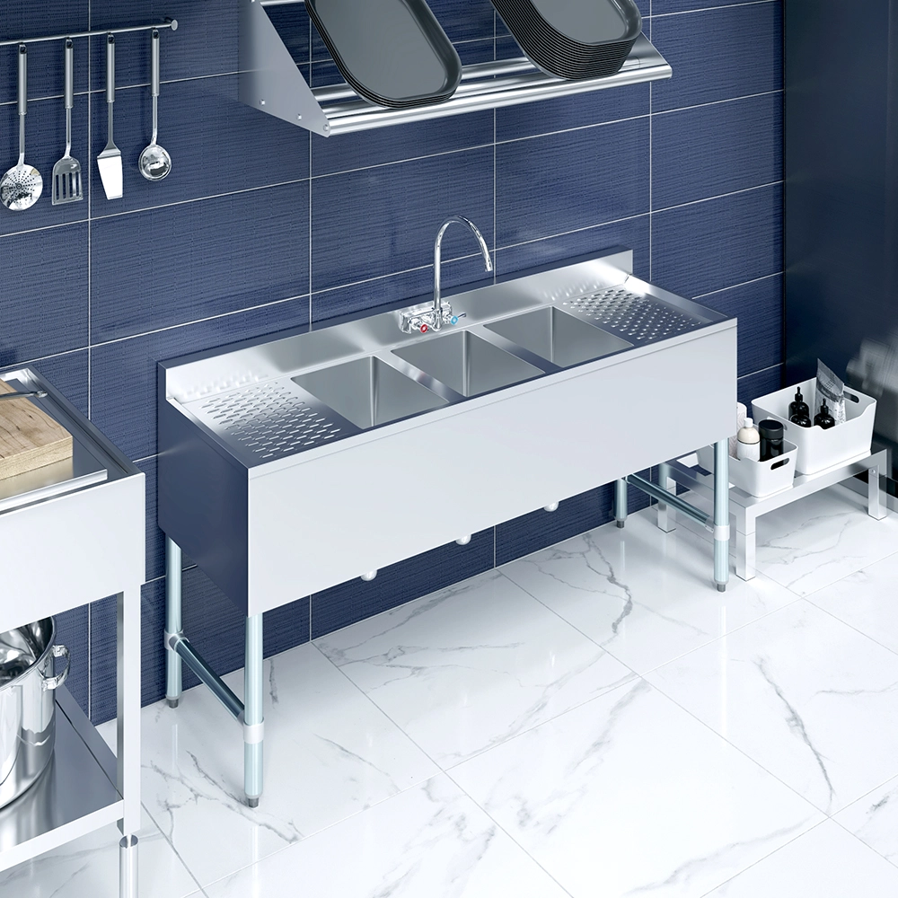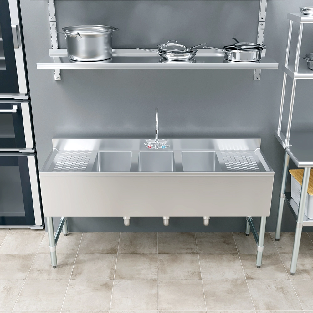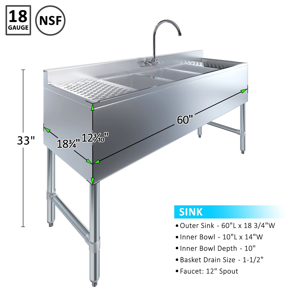 The standout feature of this sink is the dual 12″ drainboards on both the left and right sides. These drainboards offer extensive space for drying, organizing, and prepping items, significantly enhancing your workflow and efficiency. The integrated faucet provides a steady and controlled water flow, making rinsing and cleaning tasks effortless. The ergonomic design of the faucet ensures ease of use and reliability, which is crucial in busy environments.