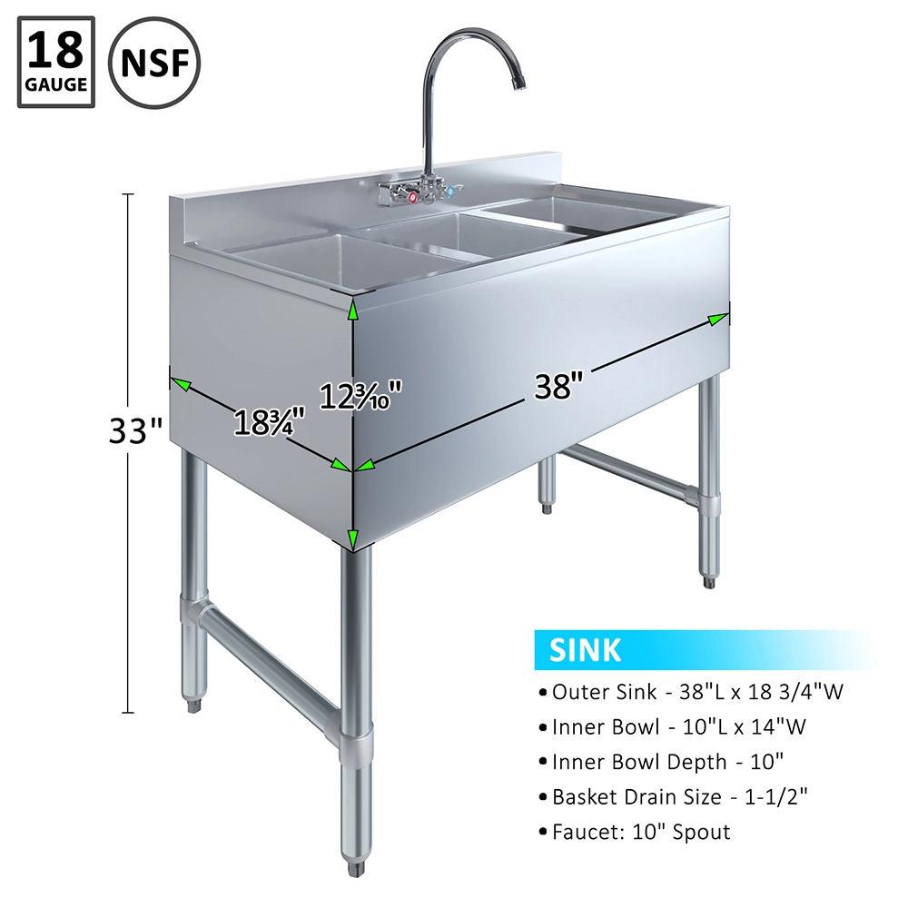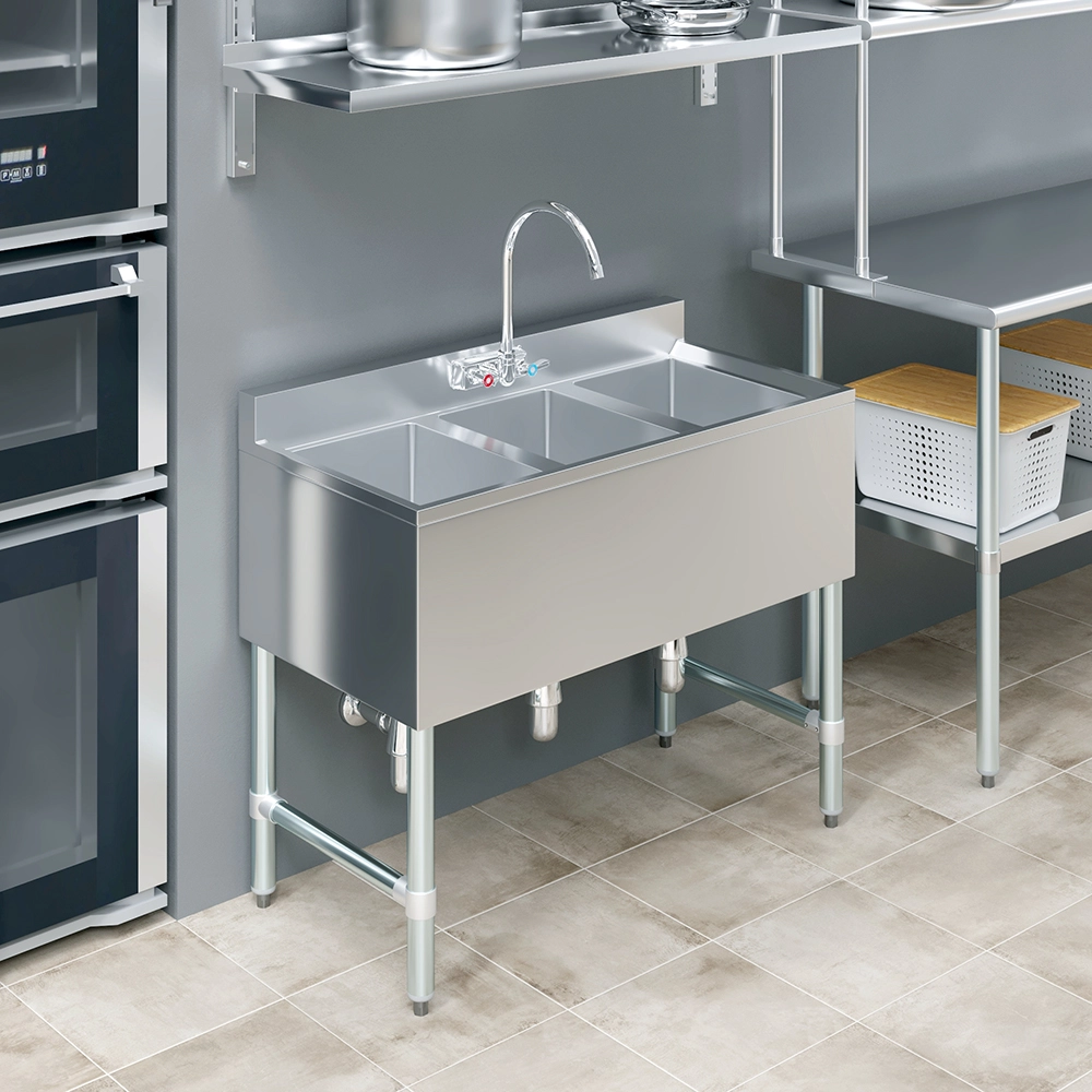 Introducing the 10″ X 14″ X 10″ Three Compartment Under Bar Sink with Faucet – your ultimate solution for maximizing efficiency and functionality in compact spaces. This under bar sink is expertly crafted from 18GA/304 stainless steel, ensuring it withstands the rigors of daily use while maintaining its sleek, modern appearance.
