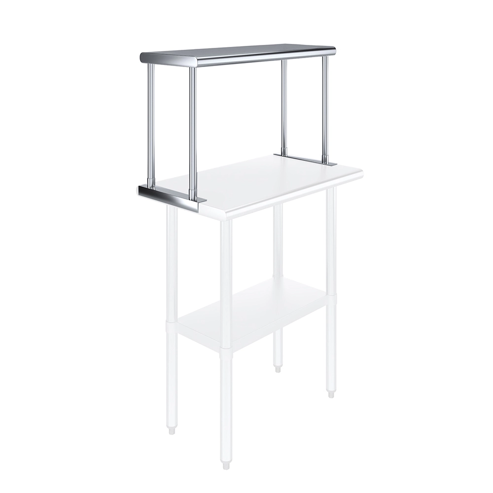 This single-tier overshelf provides additional storage space above prep tables, workstations, or countertops, keeping essential tools, ingredients, or small appliances within easy reach. Its sturdy construction supports heavy-duty use, making it ideal for restaurants, bakeries, catering businesses, and food service establishments.