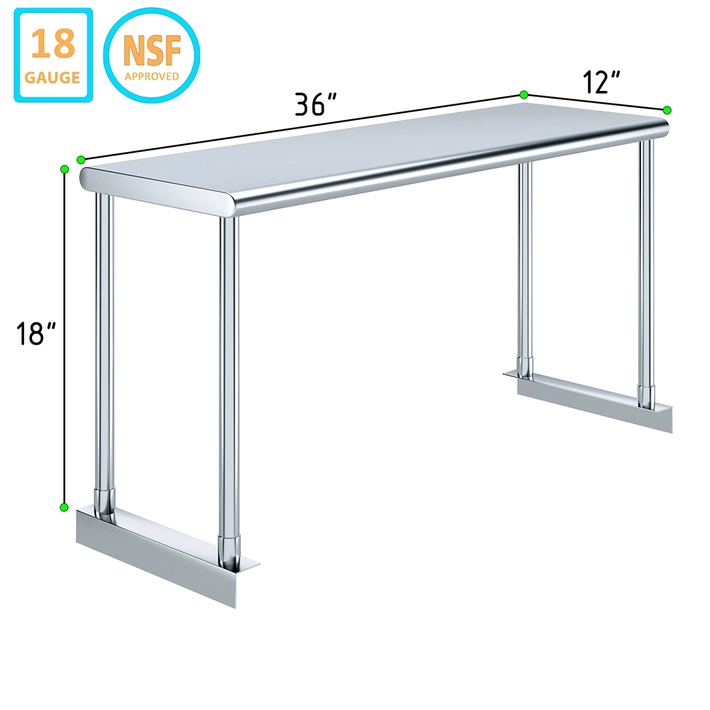 The 12 in. Deep x 36 in. Long Stainless Steel Single Tier Overshelf is a practical and durable storage solution designed to maximize efficiency in commercial kitchens. Constructed from 18GA/430 stainless steel, this overshelf is highly resistant to stains, and daily wear, ensuring long-lasting performance even in demanding food service environments. Its sleek and polished finish enhances cleanliness while maintaining a professional appearance.