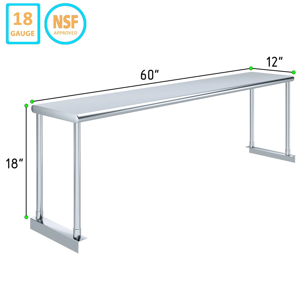 The 12 in. Deep x 60 in. Long Stainless Steel Single Tier Overshelf is a practical and durable storage solution designed to maximize efficiency in commercial kitchens. Constructed from 18GA/430 stainless steel, this overshelf is highly resistant to stains, and daily wear, ensuring long-lasting performance even in demanding food service environments. Its sleek and polished finish enhances cleanliness while maintaining a professional appearance.