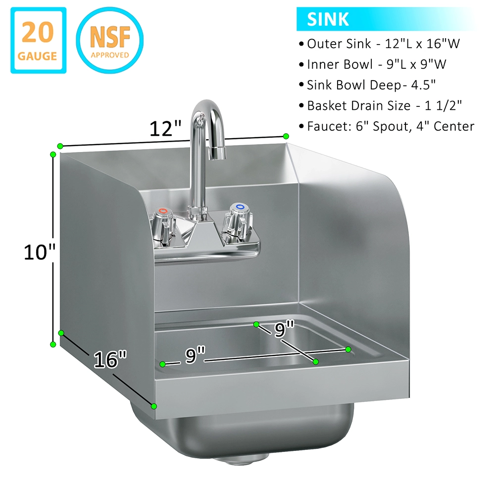Crafted from 20GA/304 stainless steel, this sink offers superior resistance, ensuring long-lasting performance and easy maintenance. The 12″ X 16″ size provides ample space for efficient hand washing, while the wall-mounted design helps save valuable floor space and keeps your work area organized.