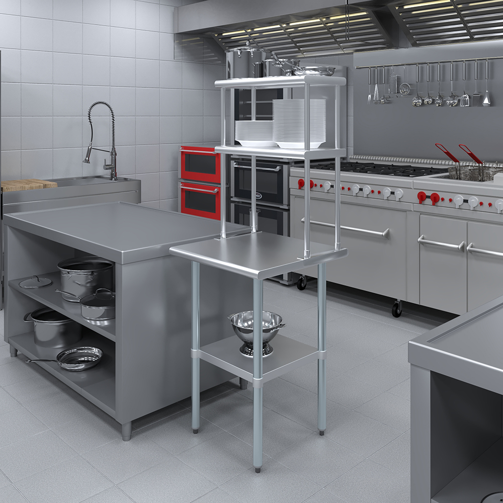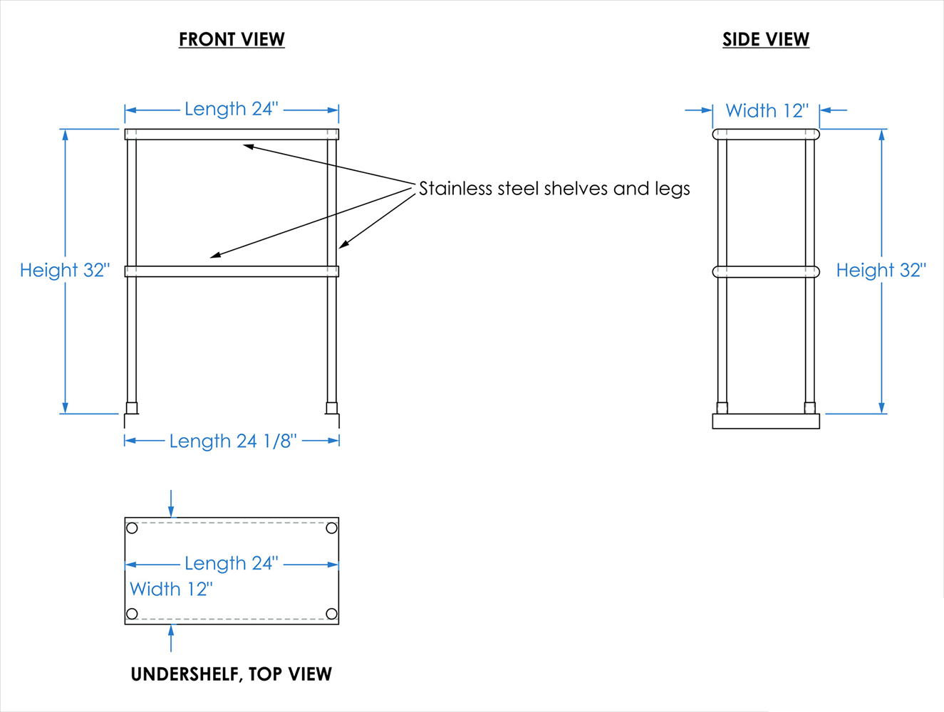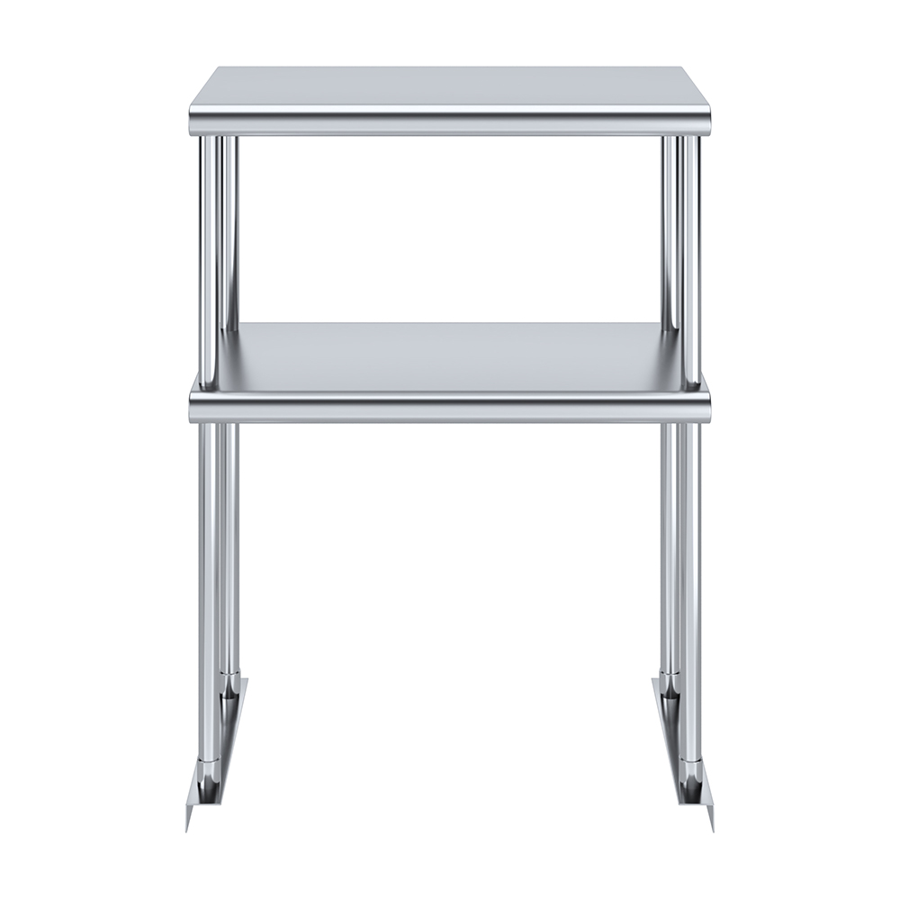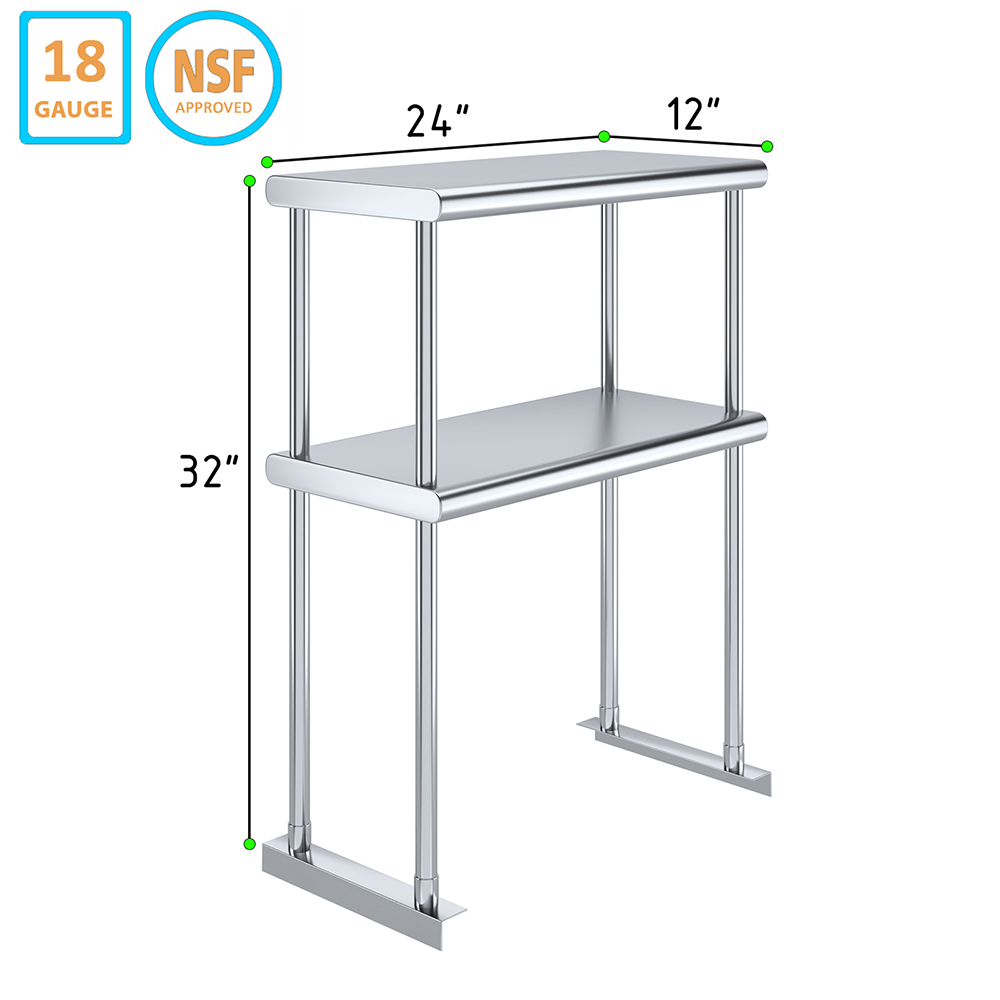 Measuring 12 inches in width and 24 inches in length, this compact yet spacious shelf offers ample storage space across two tiers. The double-tier design maximizes vertical storage capacity, making it ideal for organizing a variety of kitchen essentials, including utensils, ingredients, cookware, and equipment. The open-shelf design allows for easy access and quick retrieval of items, streamlining your workflow and improving productivity.