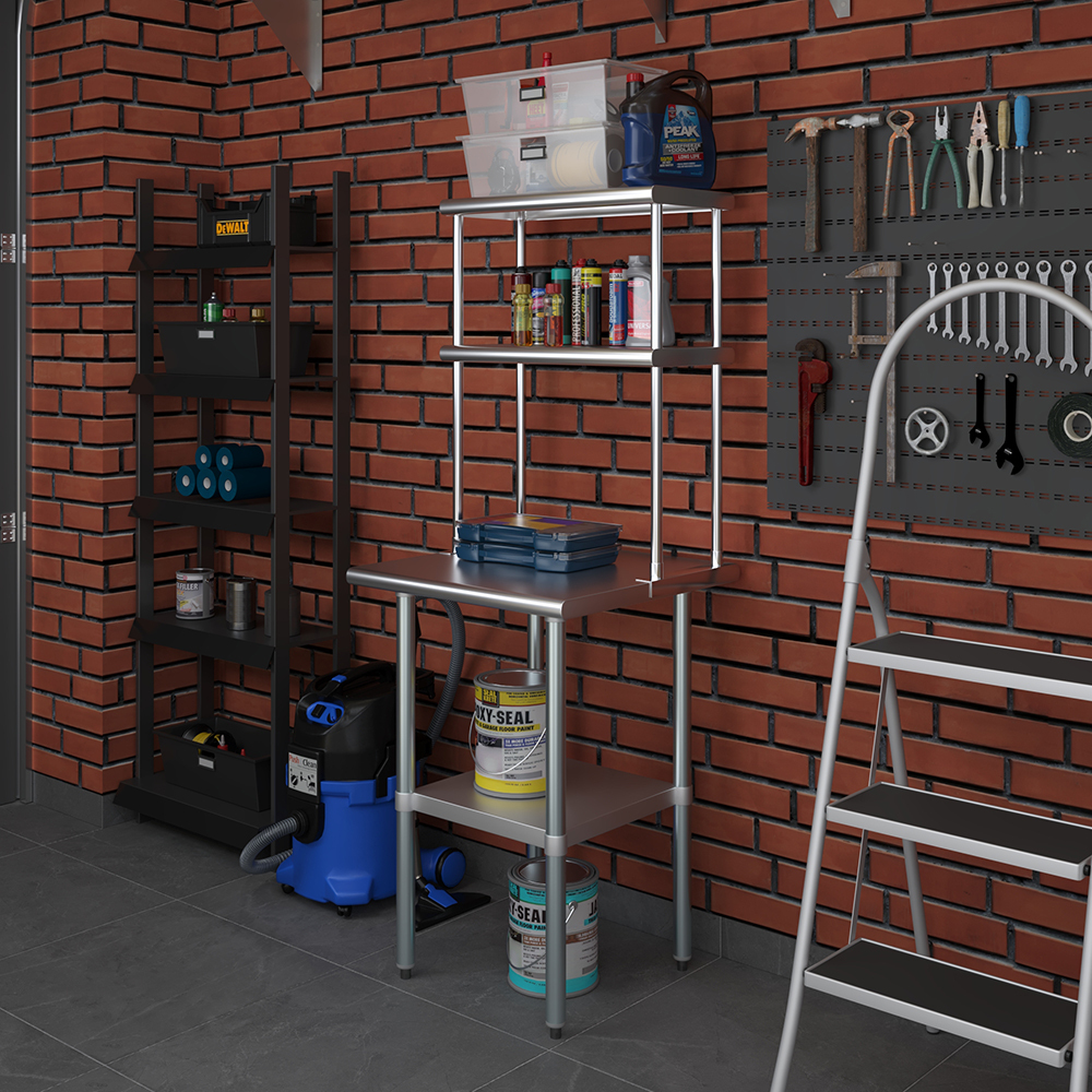 Installation is straightforward, with all necessary mounting hardware included, allowing for quick and easy setup. The versatile design of this double-tier shelf makes it suitable for various applications beyond the kitchen, such as in garages, workshops, or any area where organized storage is essential.
