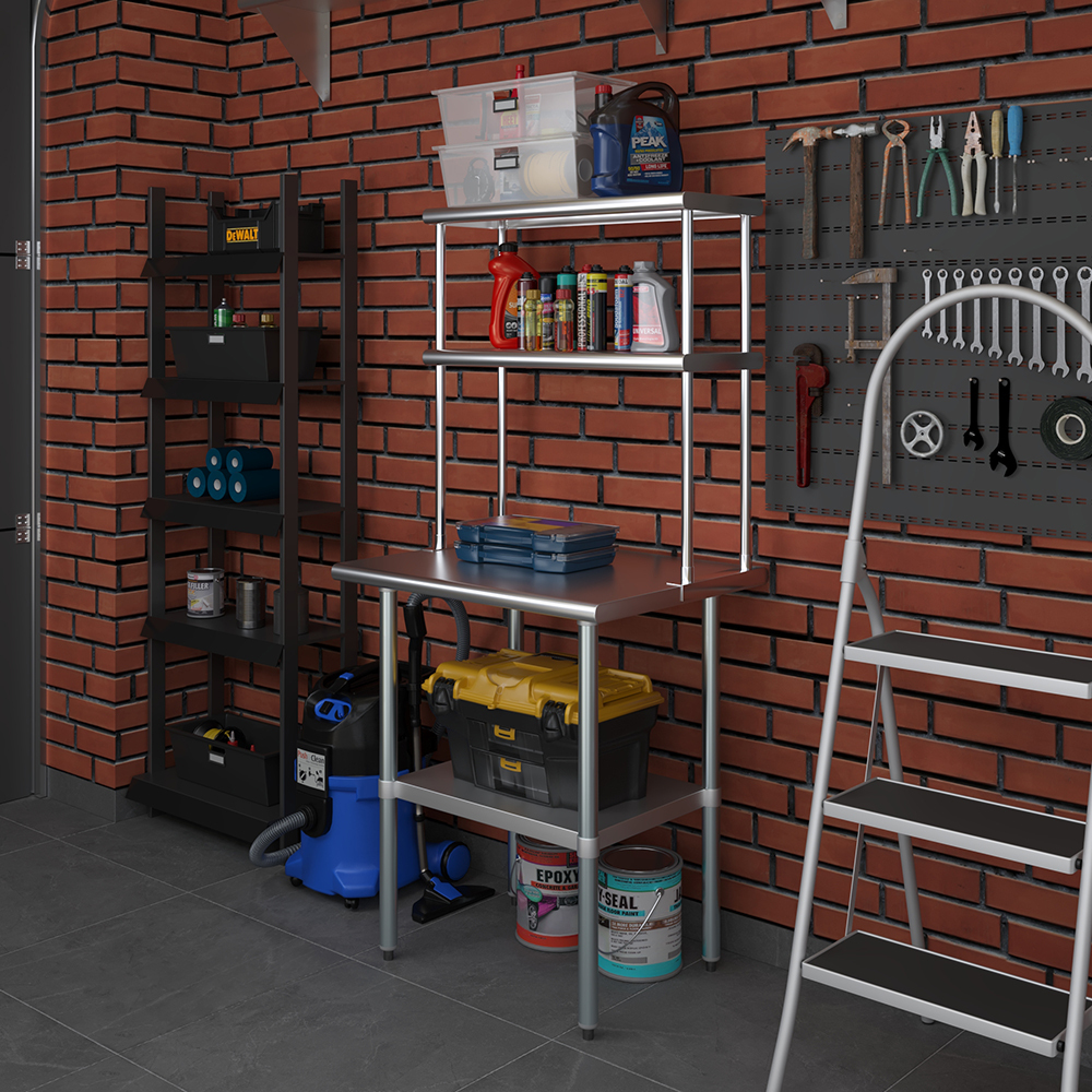 Installation is straightforward, with all necessary mounting hardware included, allowing for quick and easy setup. The versatile design of this double-tier shelf makes it suitable for various applications beyond the kitchen, such as in garages, workshops, or any area where organized storage is essential.
