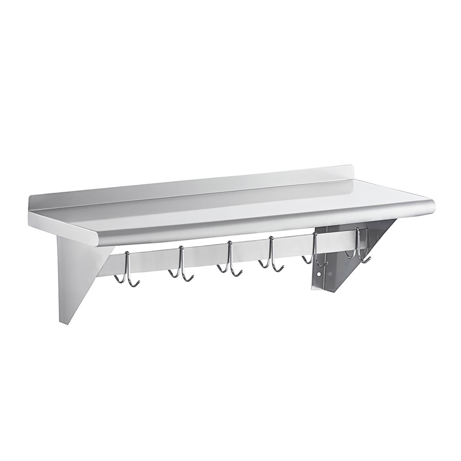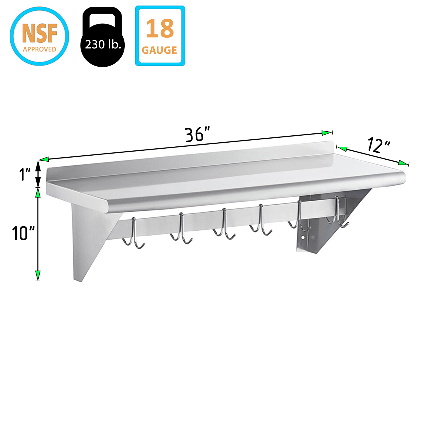 The rack features a generous 12″ x 36″ shelf, providing ample space for storing kitchen essentials, such as spices, cookbooks, and small appliances. The robust stainless steel construction ensures the shelf can support significant weight, making it a reliable storage solution. Beneath the shelf, the integrated pot rack comes with multiple sturdy hooks, perfect for hanging pots, pans, and utensils. This design keeps your cookware within easy reach, reducing clutter and making your kitchen more efficient.