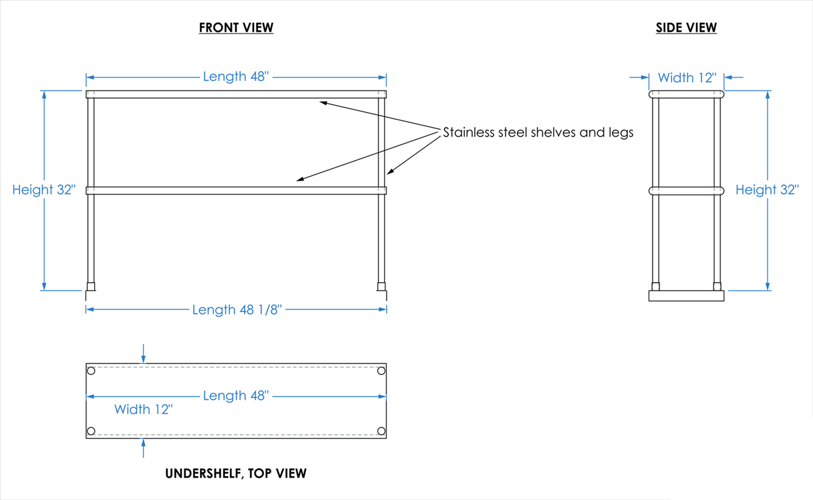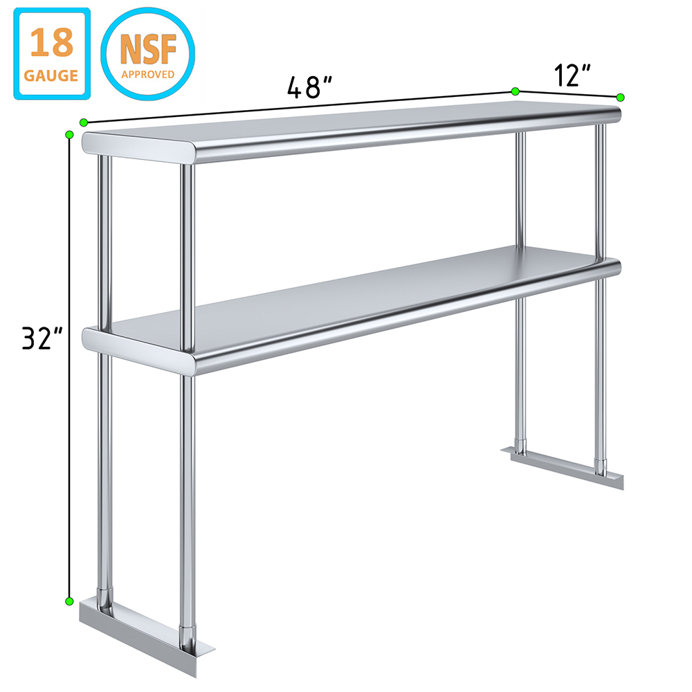 Measuring 12 inches in width and 48 inches in length, this compact yet spacious shelf offers ample storage space across two tiers. The double-tier design maximizes vertical storage capacity, making it ideal for organizing a variety of kitchen essentials, including utensils, ingredients, cookware, and equipment. The open-shelf design allows for easy access and quick retrieval of items, streamlining your workflow and improving productivity.