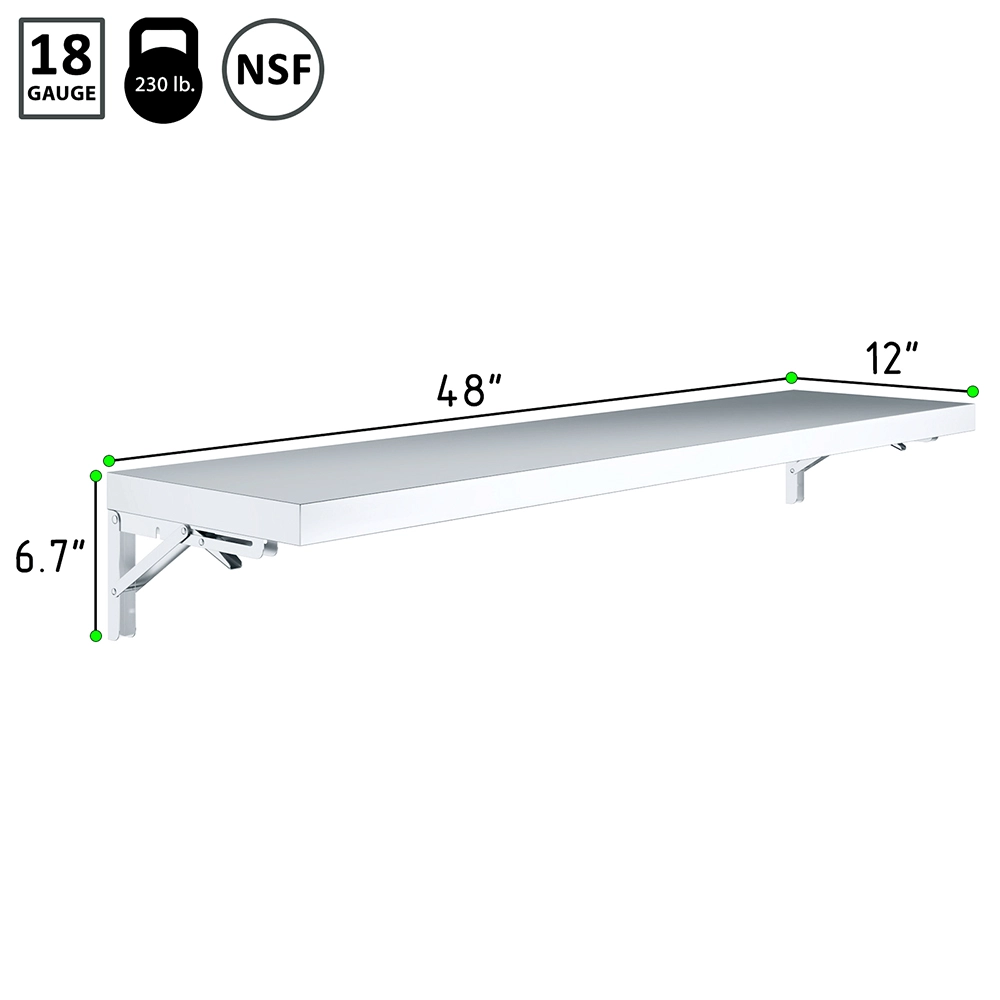 Introducing our 12″ x 48″ Stainless Steel Folding Wall Shelf, an innovative solution for maximizing space and organization in your kitchen, garage, or workspace. This quality shelf is meticulously crafted from 18GA/430 stainless steel, ensuring exceptional durability and resistance, making it ideal for both indoor and outdoor use. The sleek, modern design seamlessly integrates into any setting, adding both functionality and aesthetic appeal.