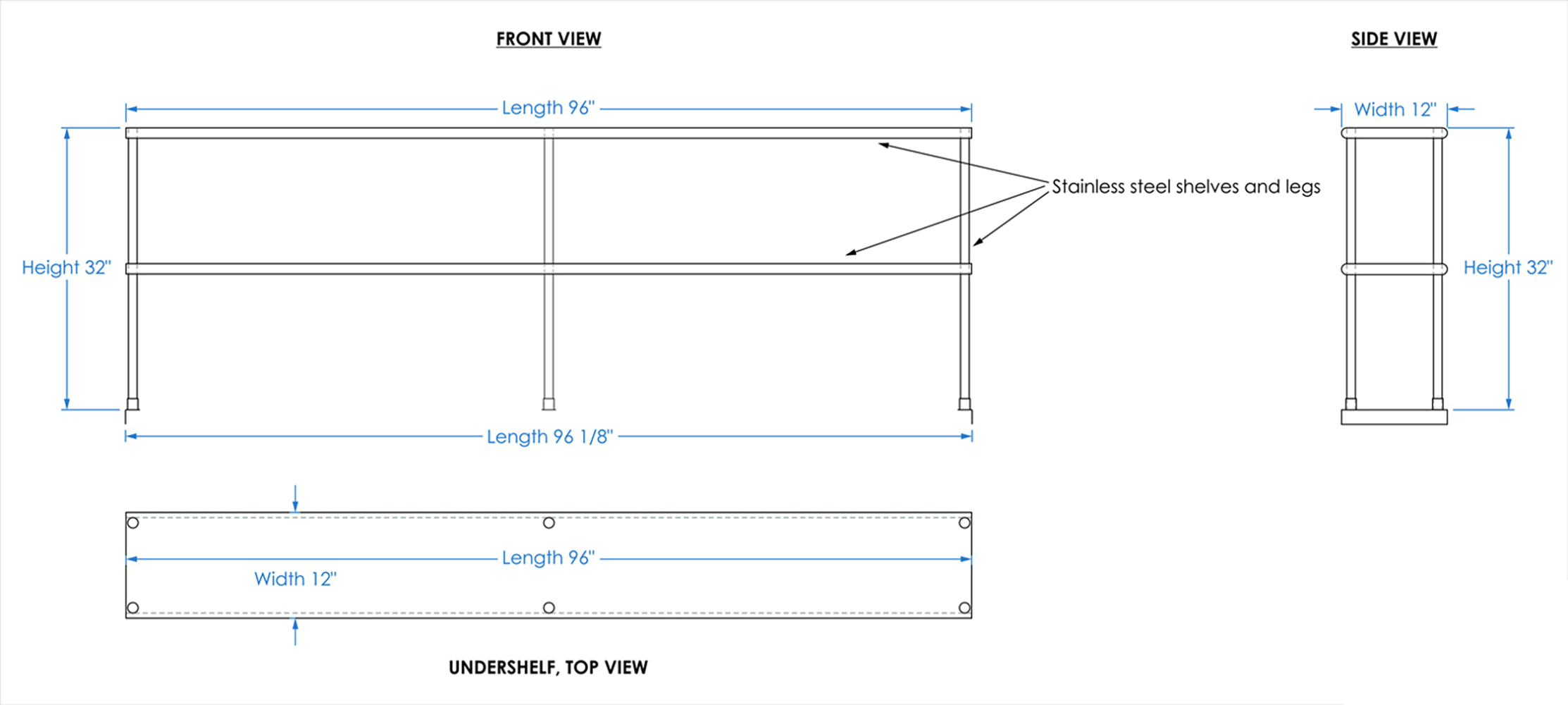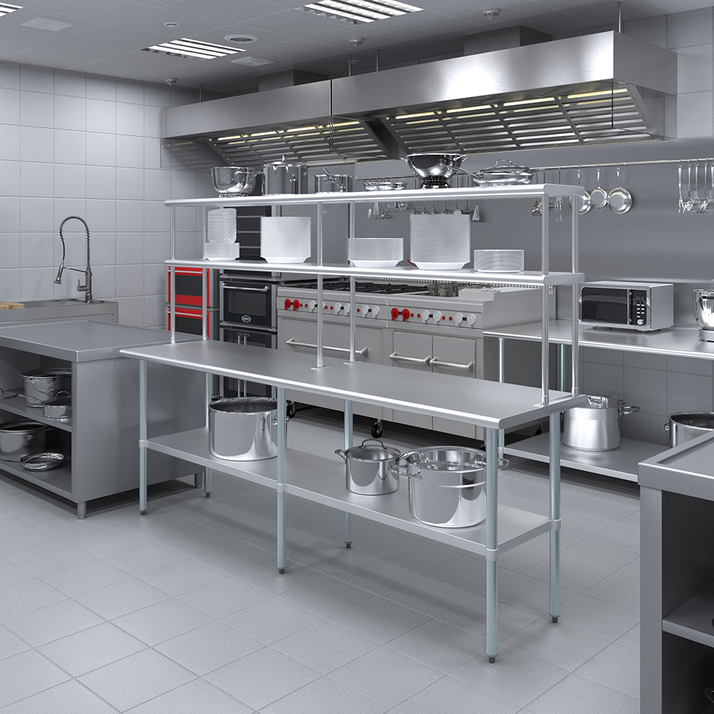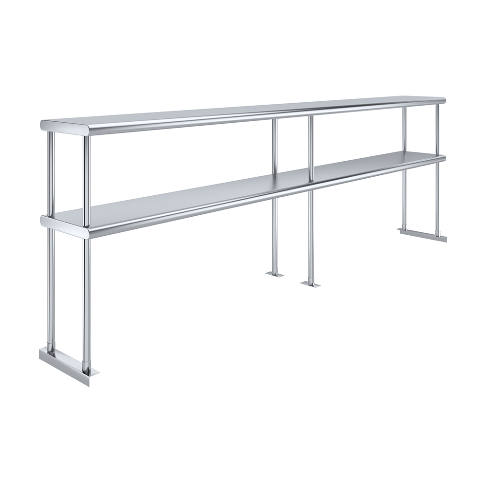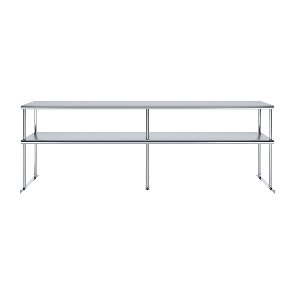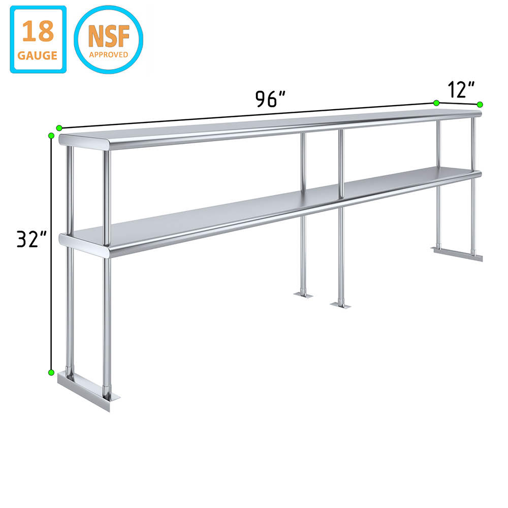 Measuring 12 inches in width and 96 inches in length, this compact yet spacious shelf offers ample storage space across two tiers. The double-tier design maximizes vertical storage capacity, making it ideal for organizing a variety of kitchen essentials, including utensils, ingredients, cookware, and equipment. The open-shelf design allows for easy access and quick retrieval of items, streamlining your workflow and improving productivity.