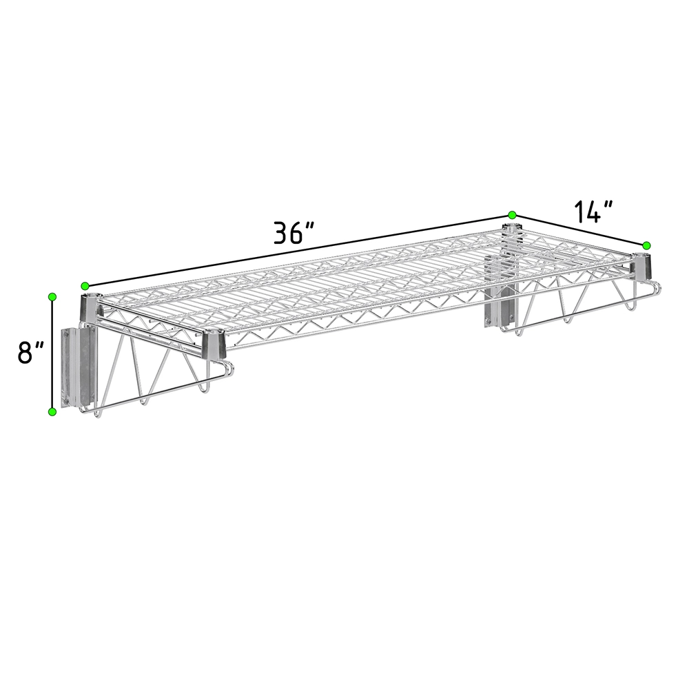 The 14 in. x 36 in. Chrome Wall Mount Wire Shelf With Brackets is a stylish and practical storage solution, ideal for both residential and commercial spaces. Constructed from heavy-duty steel and finished with a high-quality chrome plating, this wire shelf offers superior strength, durability, and resistance to rust and corrosion. Its sleek, reflective surface adds a modern touch to kitchens, pantries, garages, laundry rooms, or retail environments.