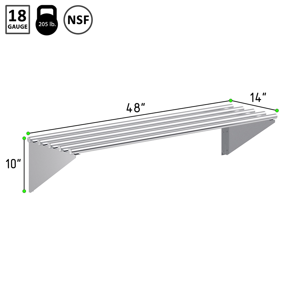 Upgrade your storage with the 14 in. x 48 in. Stainless Steel Tubular Wall Shelf. Combining practicality, durability, and aesthetic appeal, it’s the perfect addition to any professional or residential space where efficient organization and a clean, modern look are priorities. Perfect for restaurants, garages, or home kitchens, this shelf offers a versatile storage solution for any environment.