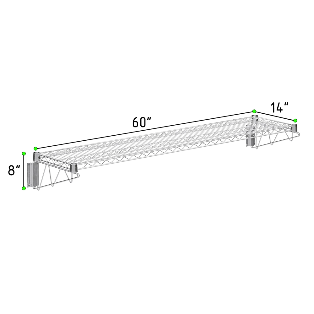 The 14 in. x 60 in. Chrome Wall Mount Wire Shelf With Brackets is a stylish and practical storage solution, ideal for both residential and commercial spaces. Constructed from heavy-duty steel and finished with a high-quality chrome plating, this wire shelf offers superior strength, durability, and resistance to rust and corrosion. Its sleek, reflective surface adds a modern touch to kitchens, pantries, garages, laundry rooms, or retail environments.
