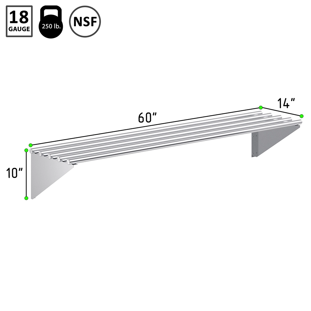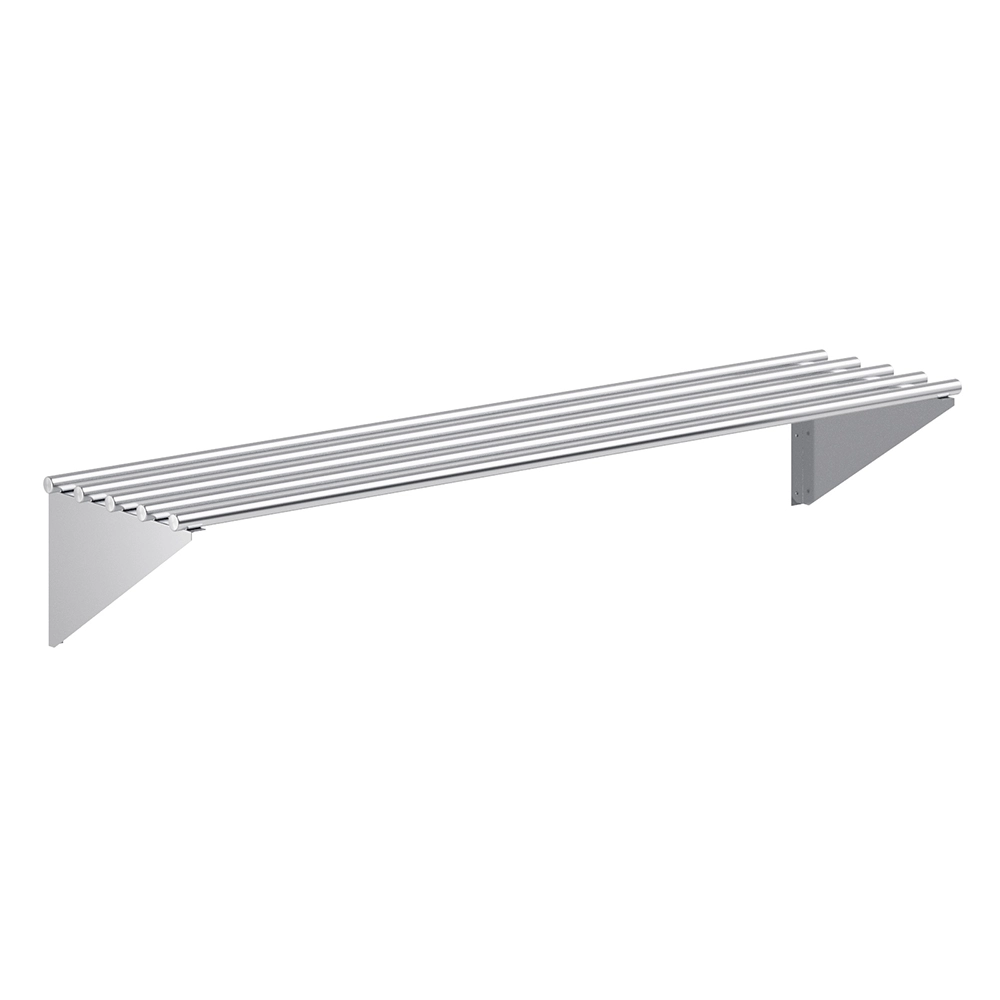 Optimize your storage space with the 14 in. x 60 in. Stainless Steel Tubular Wall Shelf, a durable and versatile solution for keeping your workspace organized. Constructed from 18GA/430 stainless steel, this shelf is built to withstand heavy use while resisting corrosion and stains, ensuring long-lasting performance in demanding environments such as commercial kitchens, workshops, and laboratories.