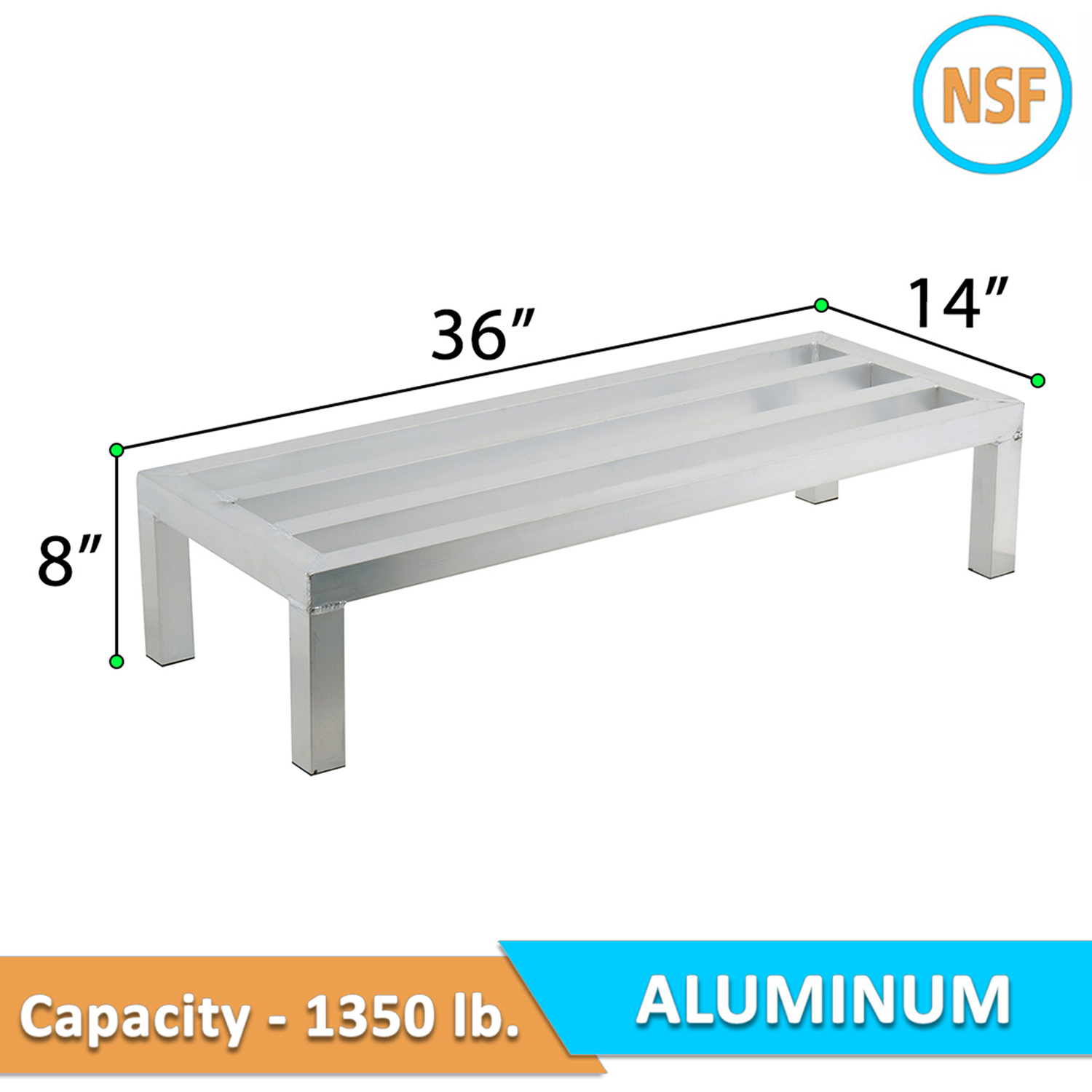 Introducing the 14″ Wide x 36″ Length x 8″ Height Aluminum Dunnage Rack, a premium storage solution designed to enhance the efficiency and organization of your commercial kitchen, warehouse, or storage room. Constructed from aluminum, this dunnage rack is built to last, offering exceptional, making it ideal for environments where durability and hygiene are paramount.