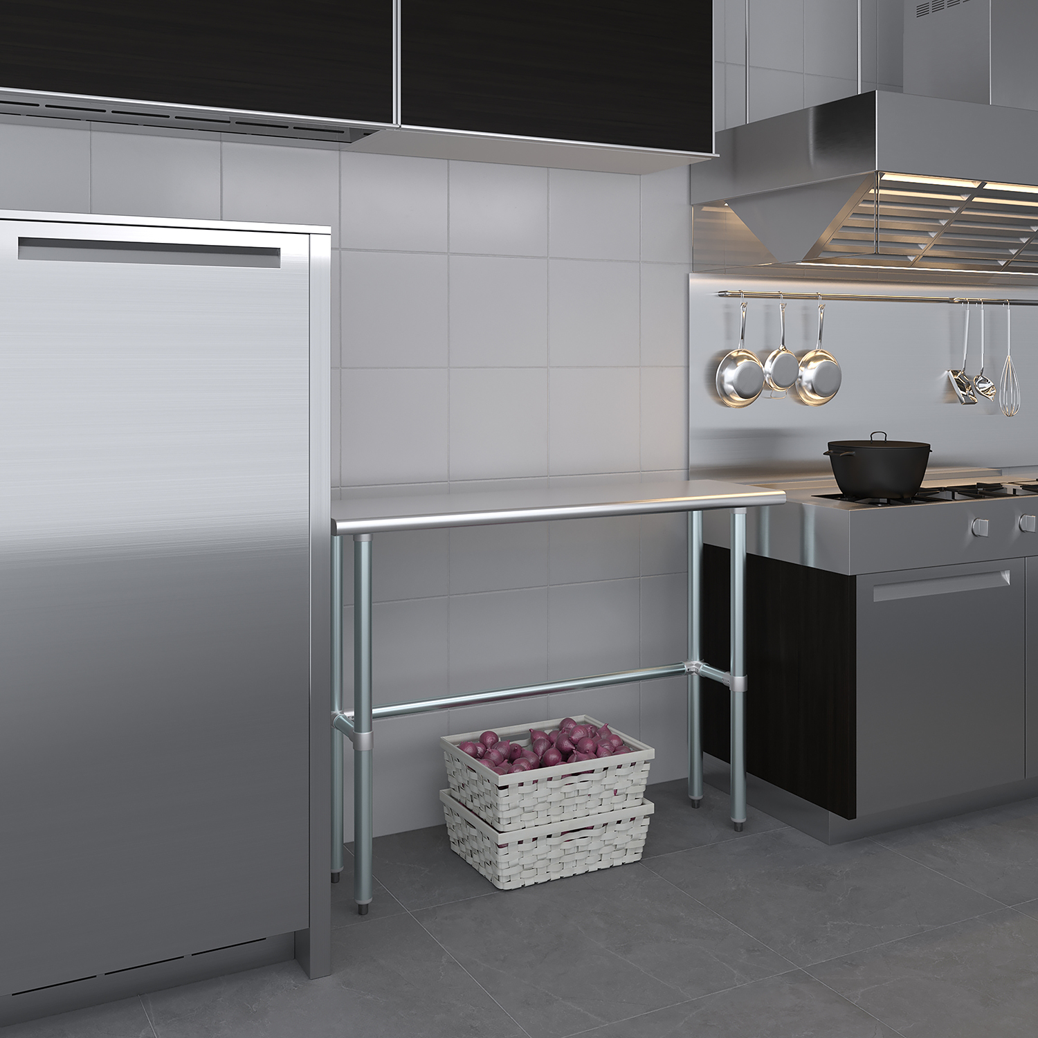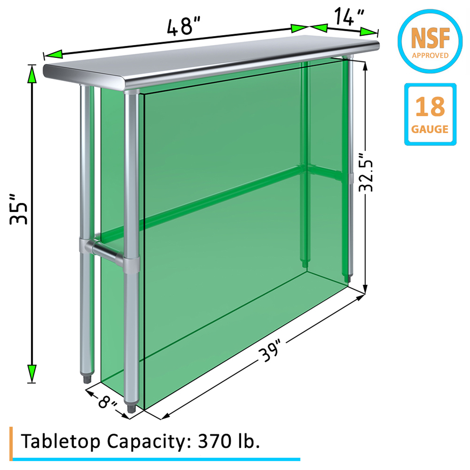 Enhance your workspace with the versatile and durable 14″ x 48″ Stainless Steel Work Table with Open Base. Crafted from 18GA/430 stainless steel, this work table is designed to withstand the rigors of daily use in commercial kitchens, workshops, laboratories, and other demanding environments. Its sleek, smooth surface is not only easy to clean but also resistant, ensuring long-lasting performance and hygiene.