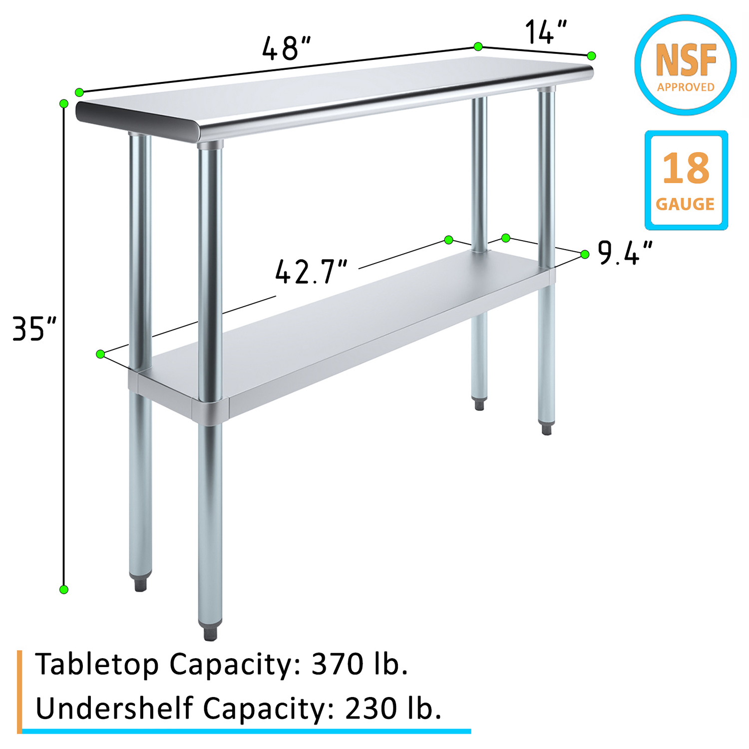 The spacious 14″ x 48″ tabletop provides ample workspace for a variety of tasks, including food preparation, equipment handling, and general workspace organization. Its smooth, polished surface is easy to clean and maintain, ensuring a hygienic environment that meets the high standards of any commercial setting.