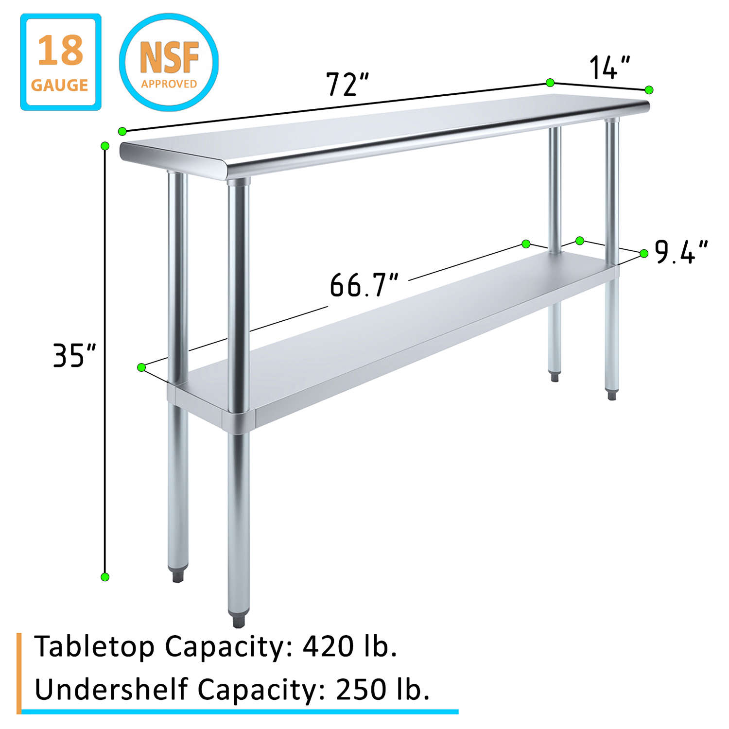The spacious 14″ x 72″ tabletop provides ample workspace for a variety of tasks, including food preparation, equipment handling, and general workspace organization. Its smooth, polished surface is easy to clean and maintain, ensuring a hygienic environment that meets the high standards of any commercial setting.