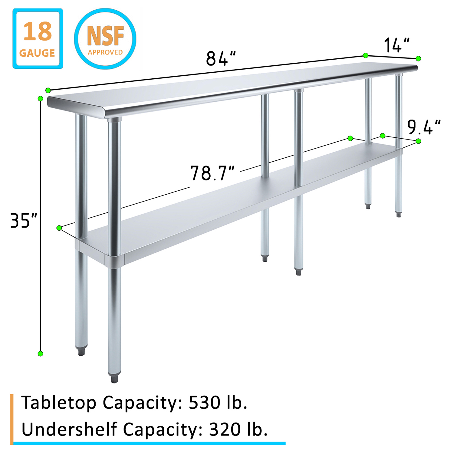 The spacious 14″ x 84″ tabletop provides ample workspace for a variety of tasks, including food preparation, equipment handling, and general workspace organization. Its smooth, polished surface is easy to clean and maintain, ensuring a hygienic environment that meets the high standards of any commercial setting.