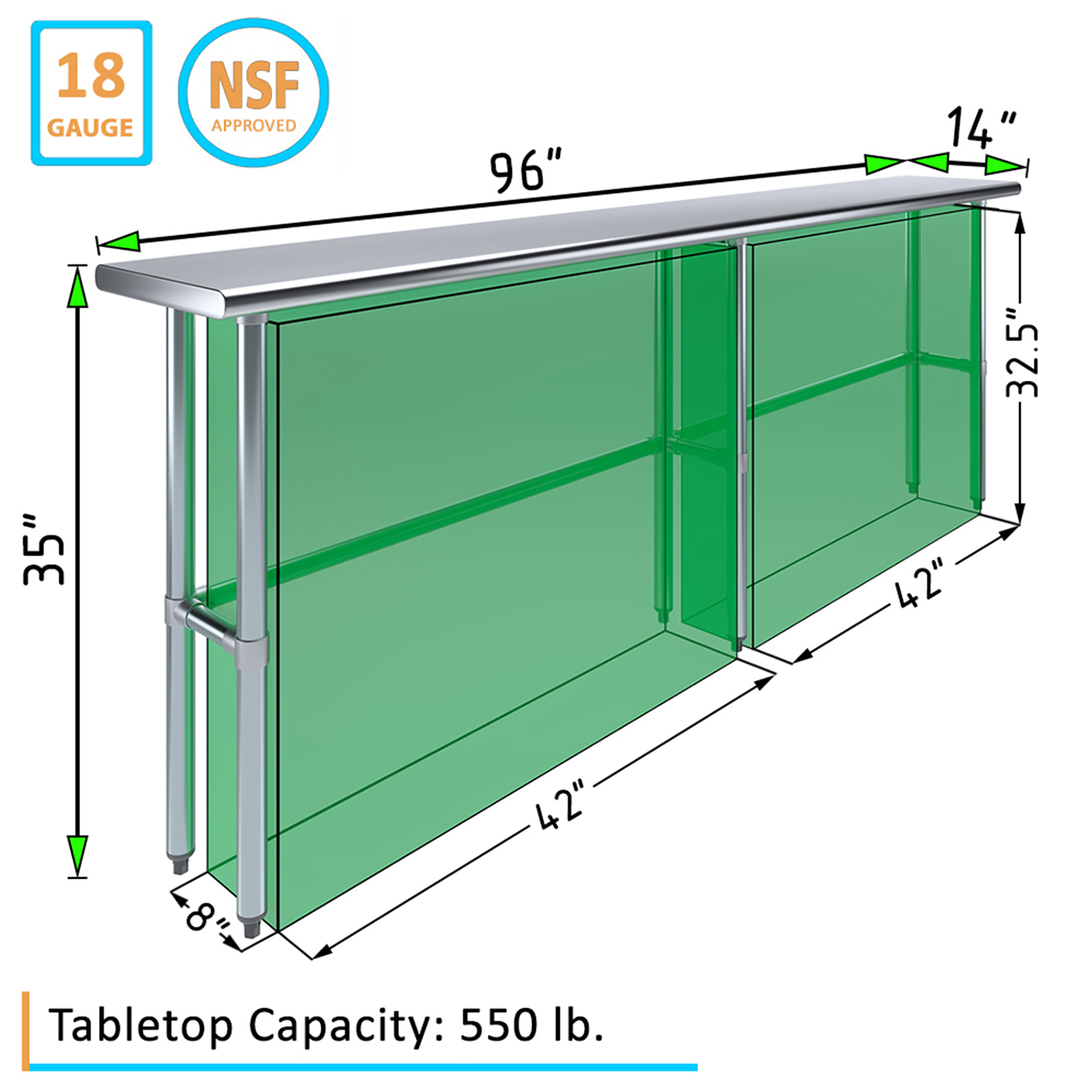 Enhance your workspace with the versatile and durable 14″ x 96″ Stainless Steel Work Table with Open Base. Crafted from 18GA/430 stainless steel, this work table is designed to withstand the rigors of daily use in commercial kitchens, workshops, laboratories, and other demanding environments. Its sleek, smooth surface is not only easy to clean but also resistant, ensuring long-lasting performance and hygiene.
