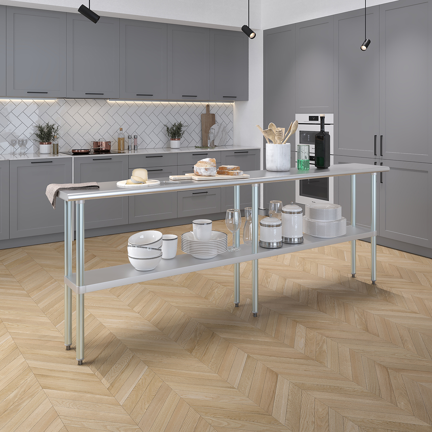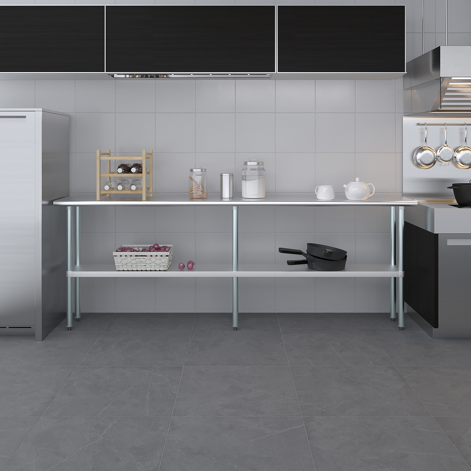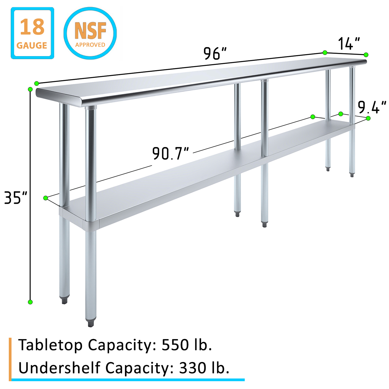 The spacious 14″ x 96″ tabletop provides ample workspace for a variety of tasks, including food preparation, equipment handling, and general workspace organization. Its smooth, polished surface is easy to clean and maintain, ensuring a hygienic environment that meets the high standards of any commercial setting.