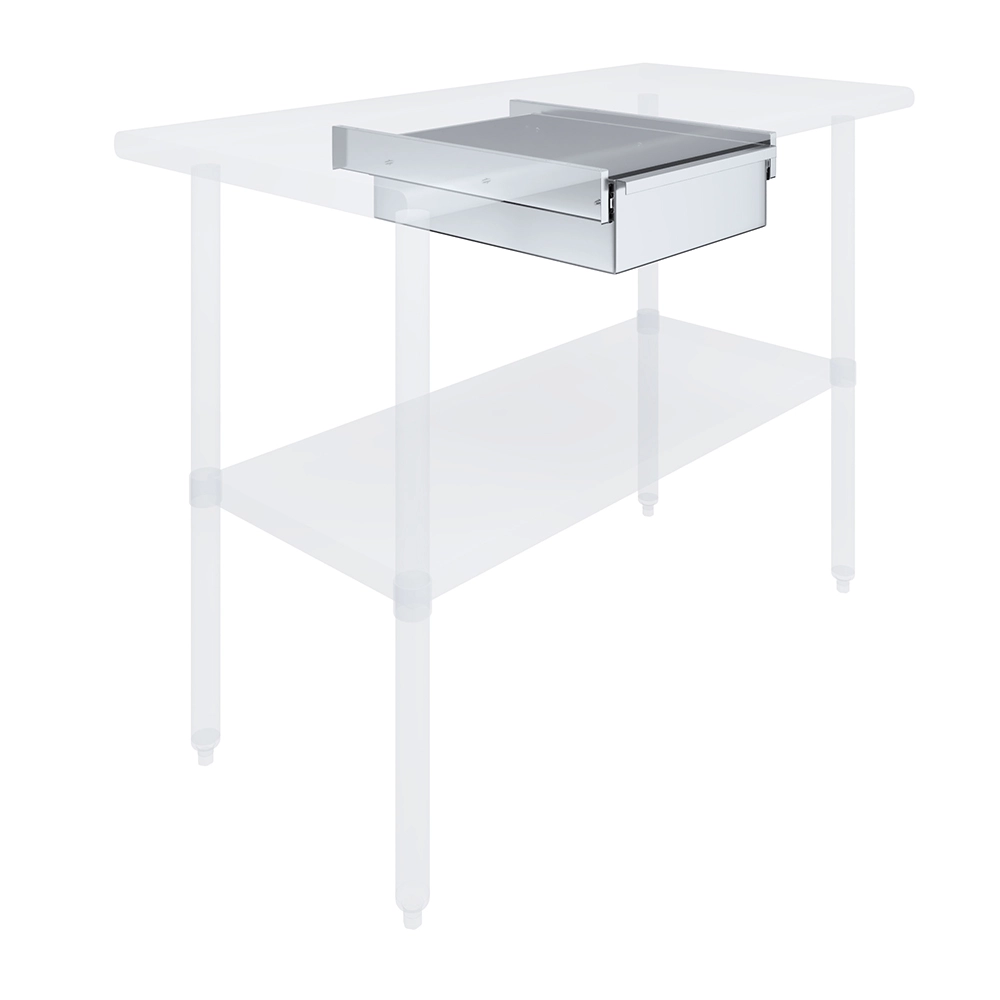 Installation is straightforward, with all necessary mounting hardware included, allowing for quick and easy setup. Whether you’re looking to add storage to a worktable, prep station, or any other work surface, this drawer integrates seamlessly, enhancing the overall functionality of your workspace.