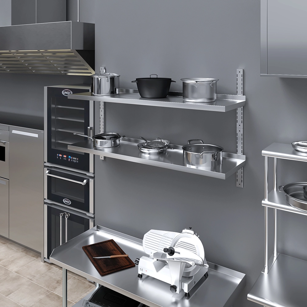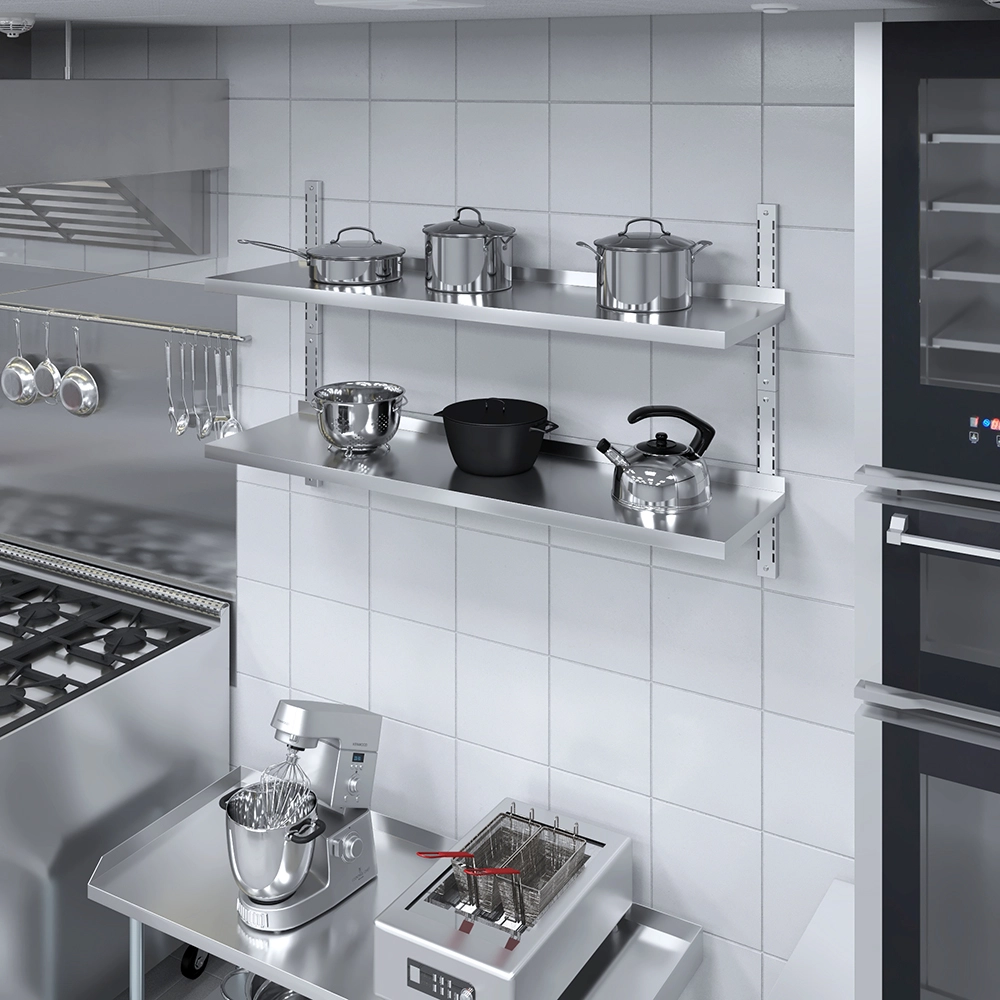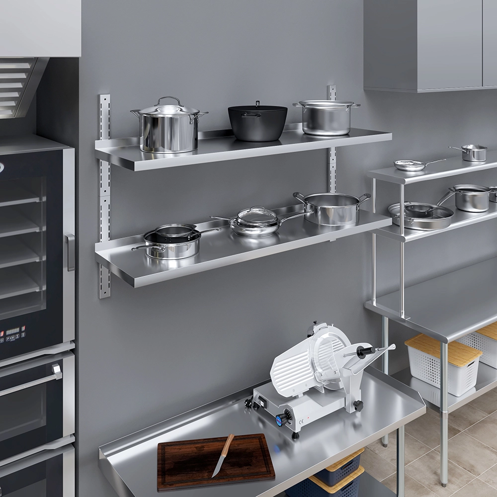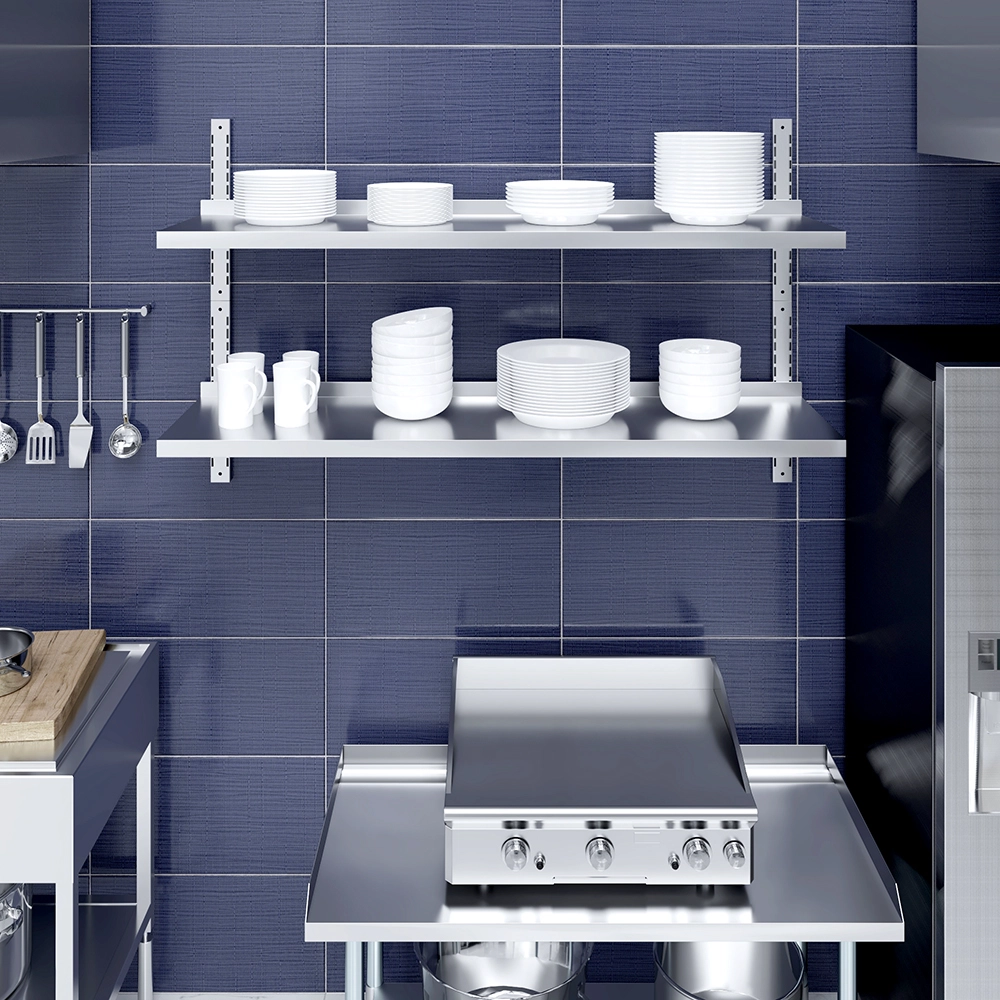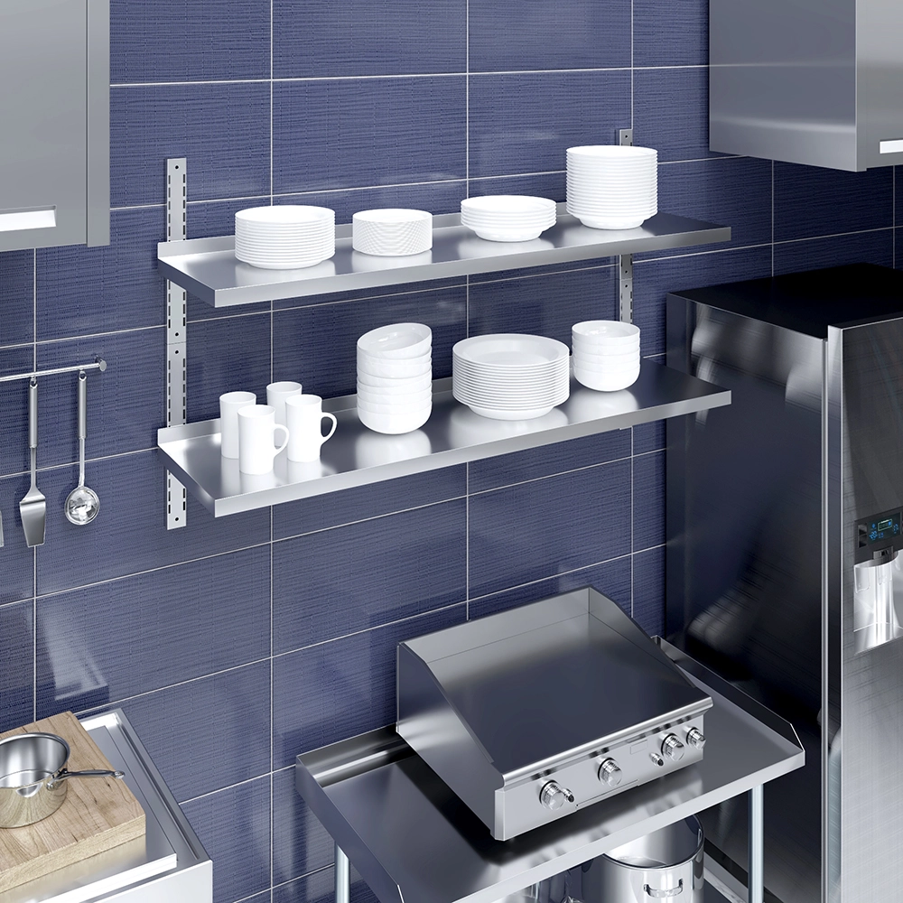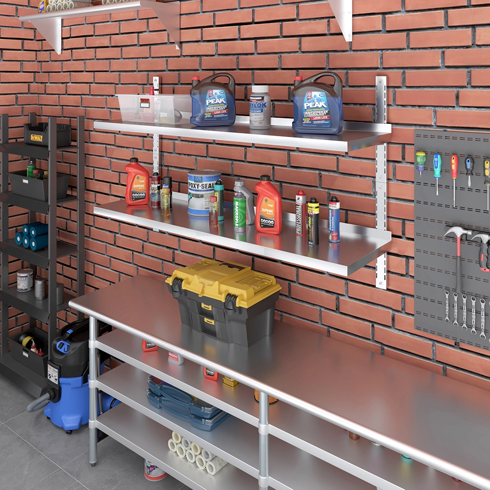 Easy to install, this wall-mounted shelf comes with all the necessary hardware for secure attachment, ensuring stability and peace of mind. Its sleek, modern appearance features clean lines and a polished finish that blends seamlessly into any environment, from contemporary kitchens to industrial-style workshops. The open design allows for easy visibility and access to items, further enhancing convenience and efficiency.