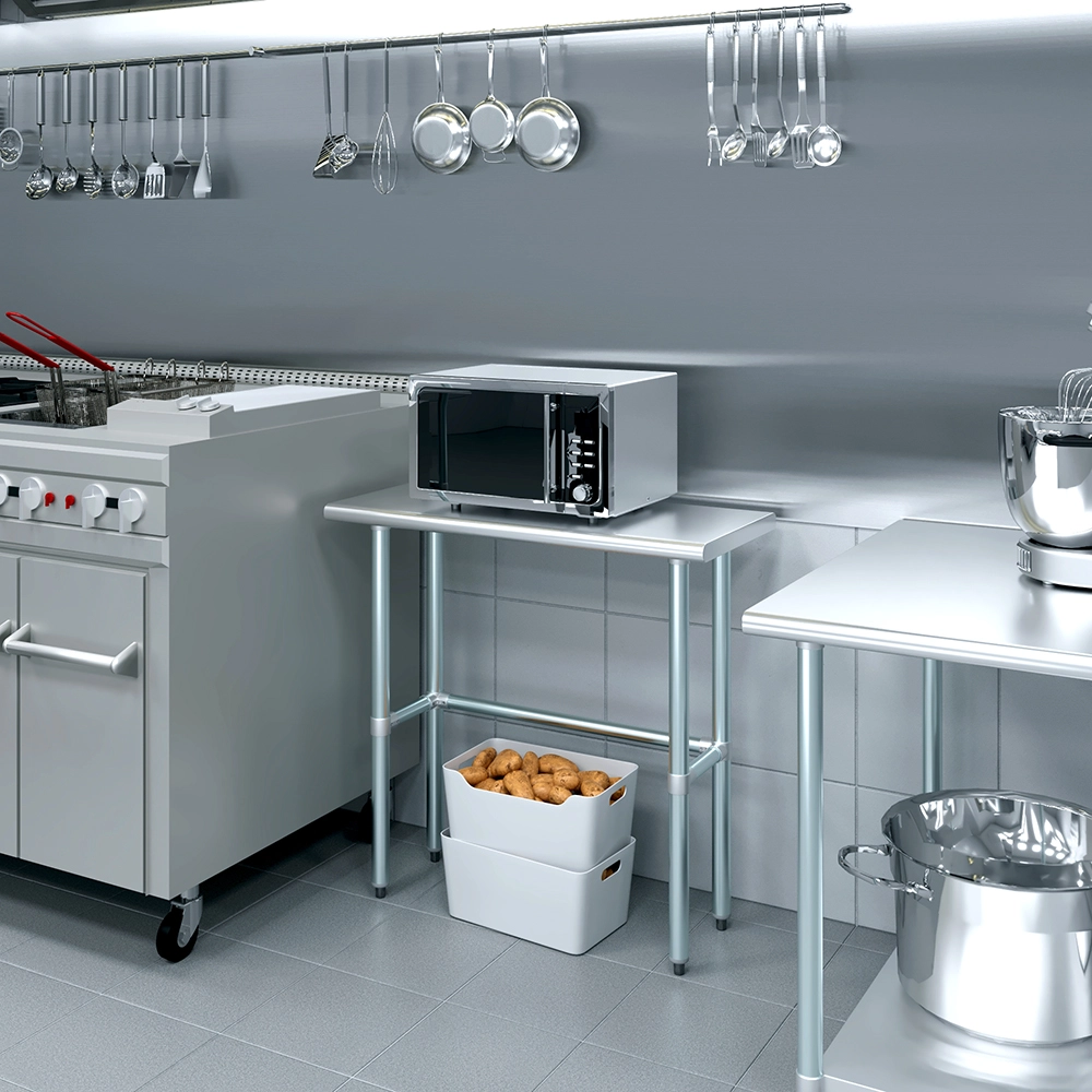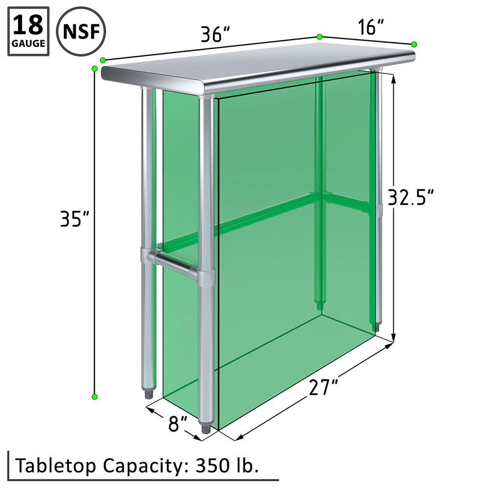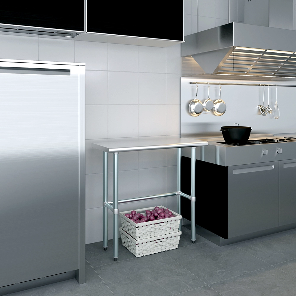 Enhance your workspace with the versatile and durable 16″ x 36″ Stainless Steel Work Table with Open Base. Crafted from 18GA/430 stainless steel, this work table is designed to withstand the rigors of daily use in commercial kitchens, workshops, laboratories, and other demanding environments. Its sleek, smooth surface is not only easy to clean but also resistant, ensuring long-lasting performance and hygiene.