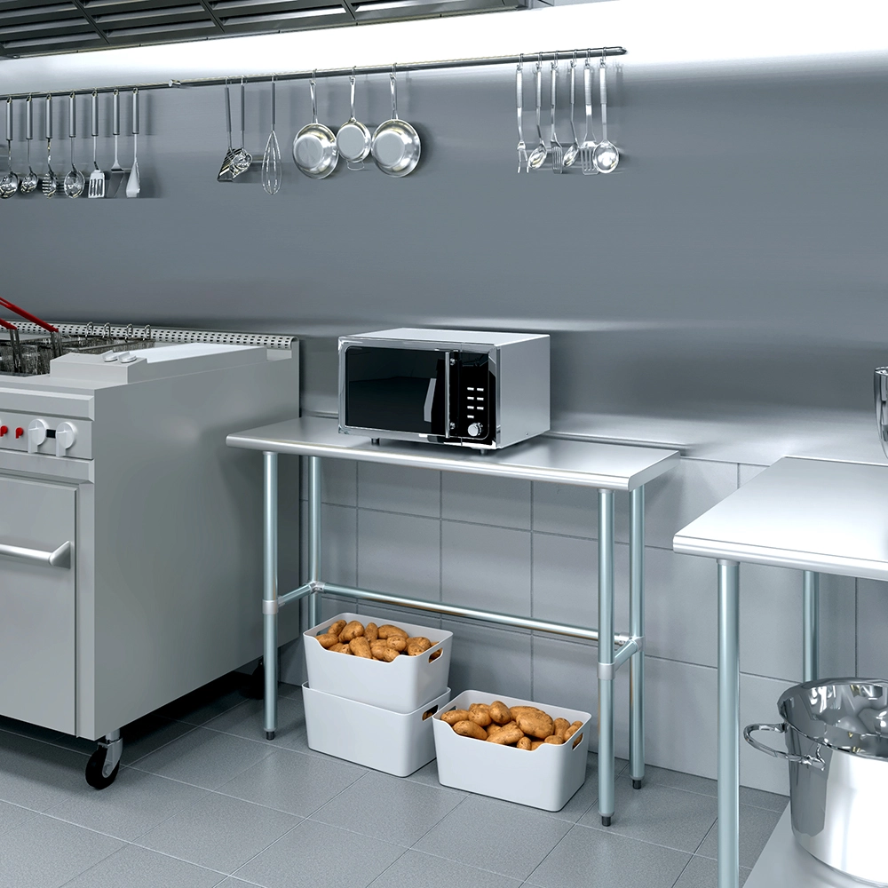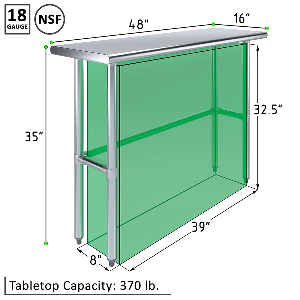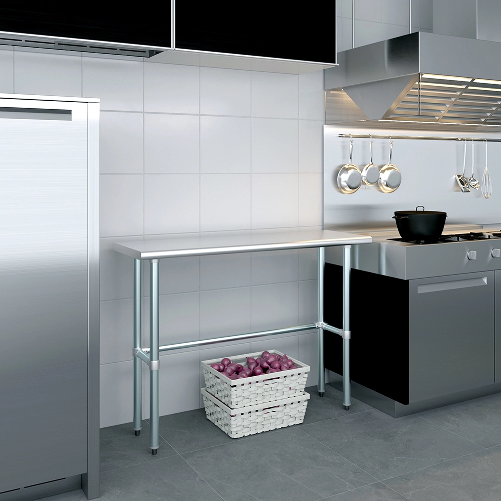 Enhance your workspace with the versatile and durable 16″ x 48″ Stainless Steel Work Table with Open Base. Crafted from 18GA/430 stainless steel, this work table is designed to withstand the rigors of daily use in commercial kitchens, workshops, laboratories, and other demanding environments. Its sleek, smooth surface is not only easy to clean but also resistant, ensuring long-lasting performance and hygiene.