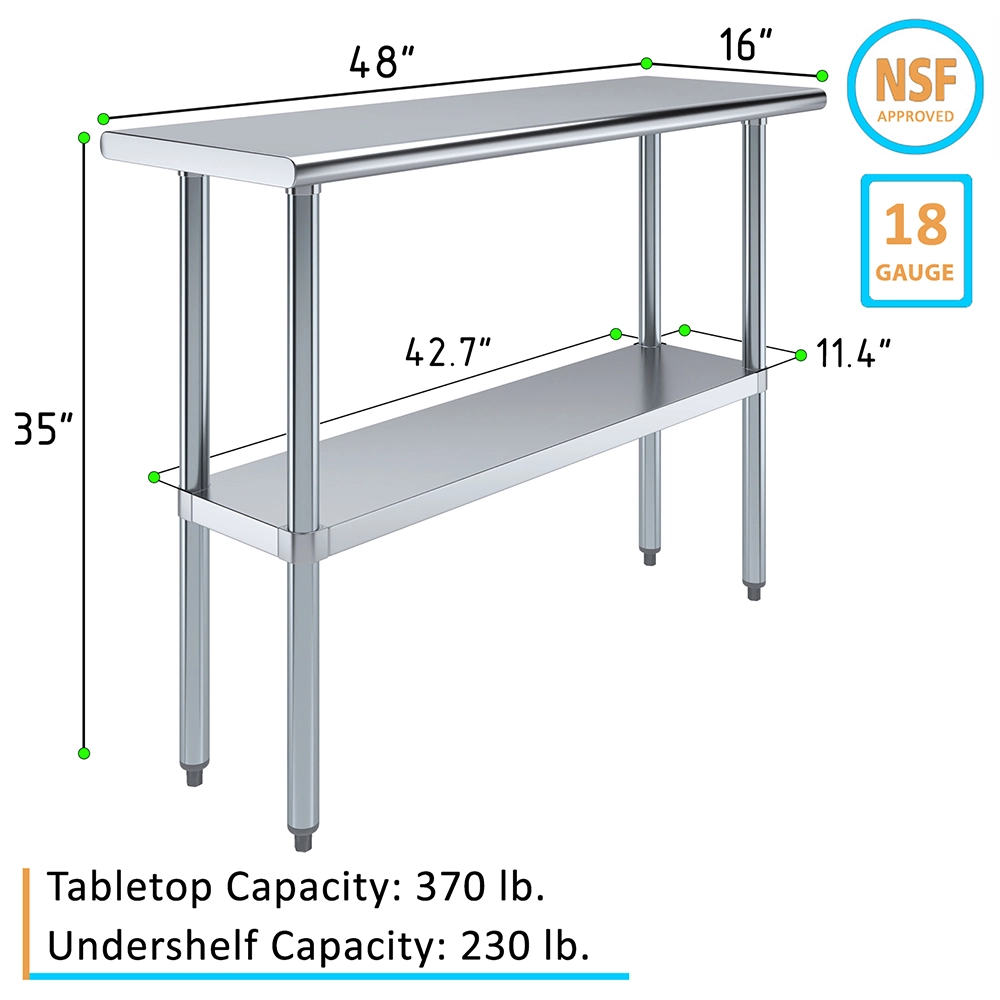 The spacious 16″ x 48″ tabletop provides ample workspace for a variety of tasks, including food preparation, equipment handling, and general workspace organization. Its smooth, polished surface is easy to clean and maintain, ensuring a hygienic environment that meets the high standards of any commercial setting.