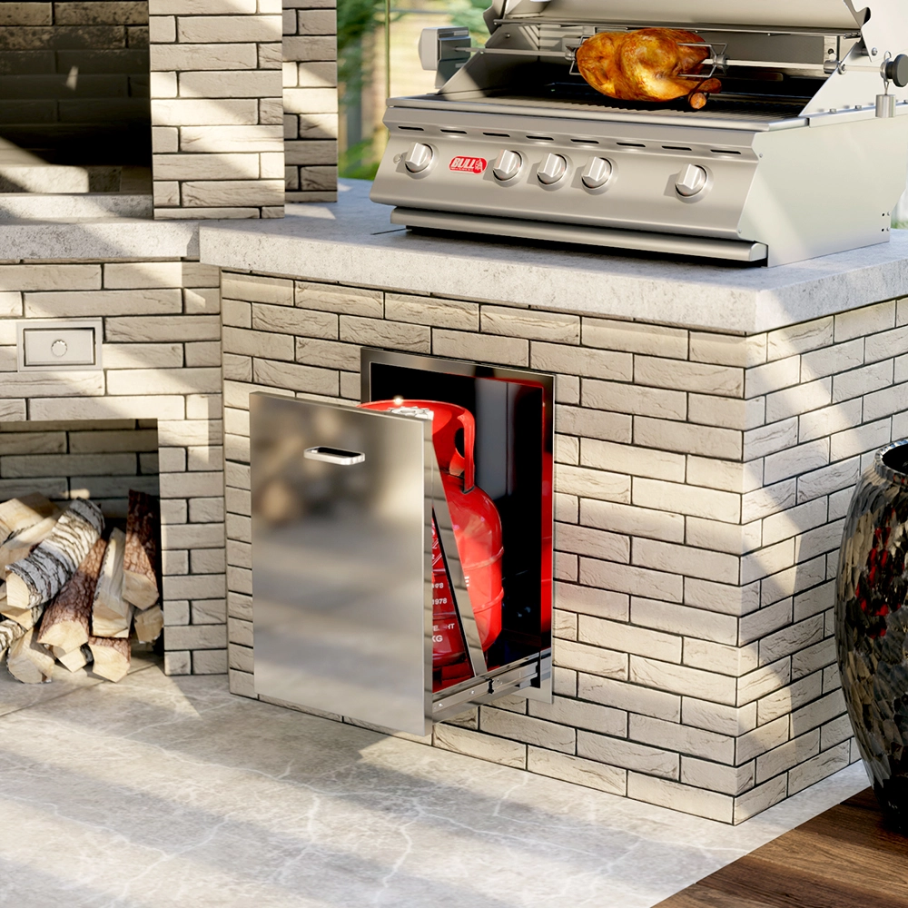 The sleek, enclosed design not only protects the tank from the elements but also provides a clean, professional appearance that seamlessly integrates into your outdoor cooking setup. Ideal for enhancing the safety, organization, and aesthetic of your outdoor kitchen, this propane tank drawer is a smart and stylish addition to any modern grilling environment.