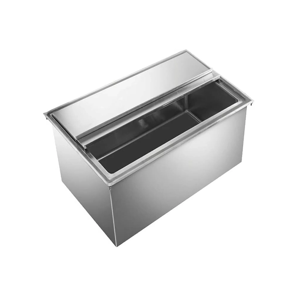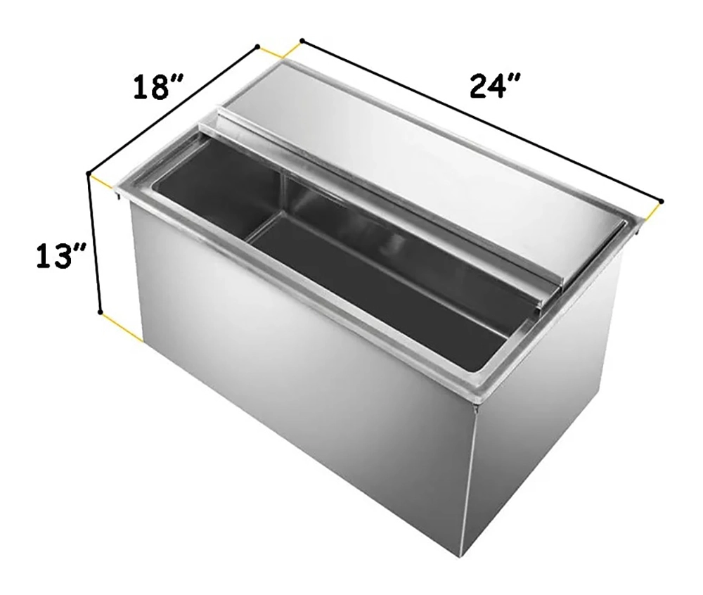 Enhance your beverage service with the 18 in. x 24 in. Stainless Steel Drop-In Ice Bin, a durable and practical solution for keeping ice readily accessible in any professional setting. Crafted from 20GA/304 stainless steel, this ice bin is designed to resist corrosion and wear, ensuring long-lasting performance in demanding environments like bars, restaurants, and catering events.