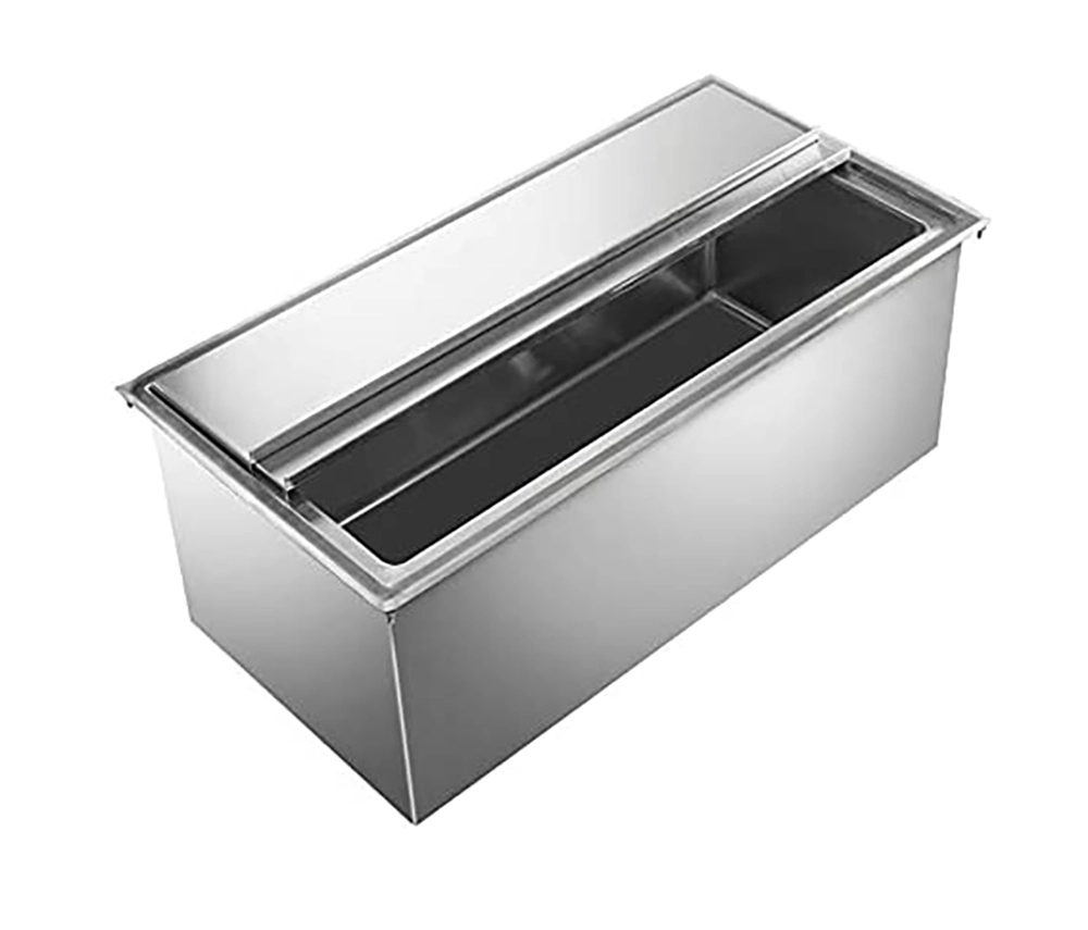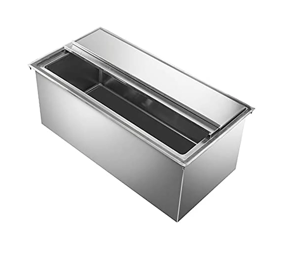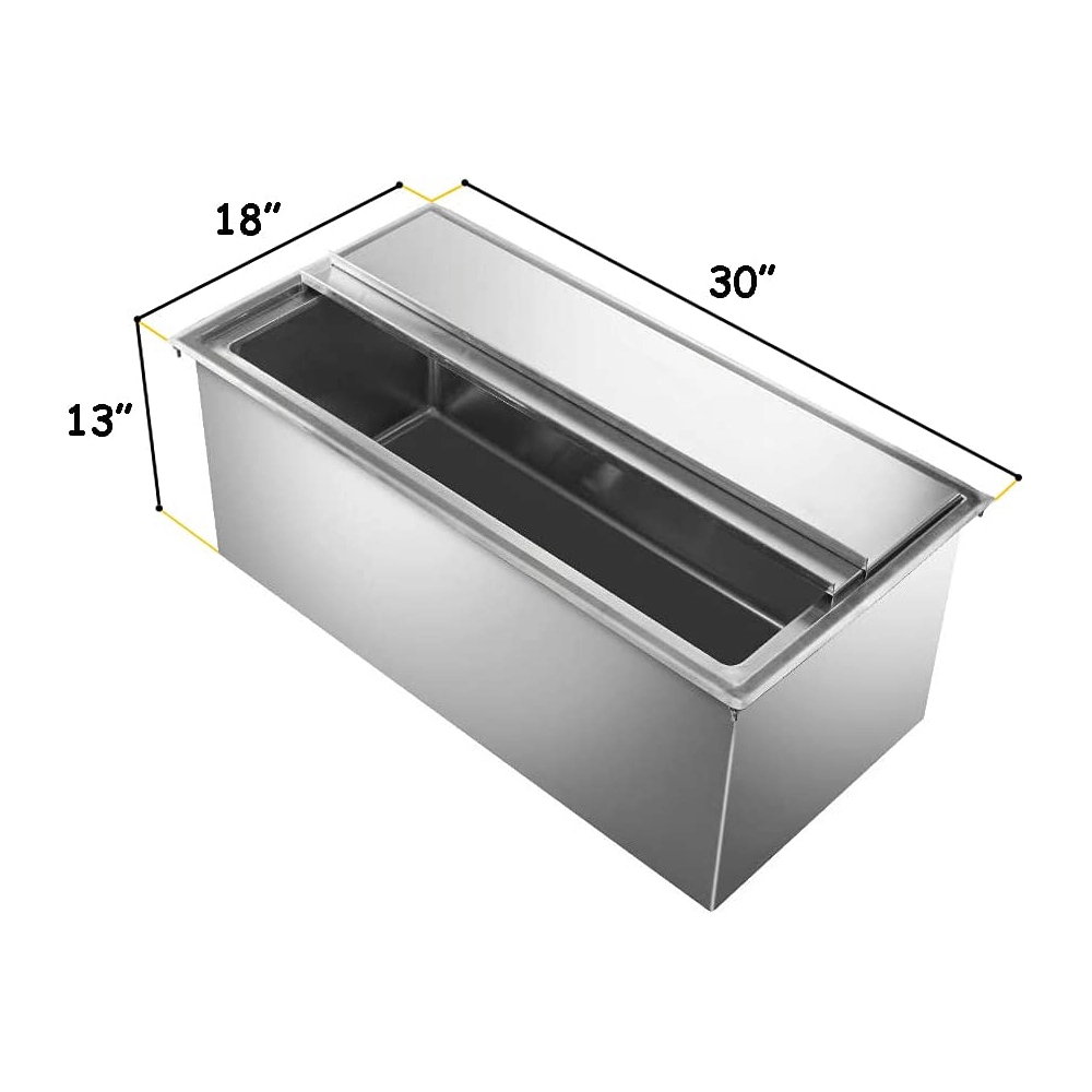 This drop-in ice bin is designed to fit seamlessly into countertops, creating a clean and efficient workspace while maximizing available space. Measuring 18 inches by 30 inches, it provides ample capacity for storing ice, making it ideal for high-volume service areas. The compact design ensures that it integrates smoothly into a variety of setups without compromising functionality.