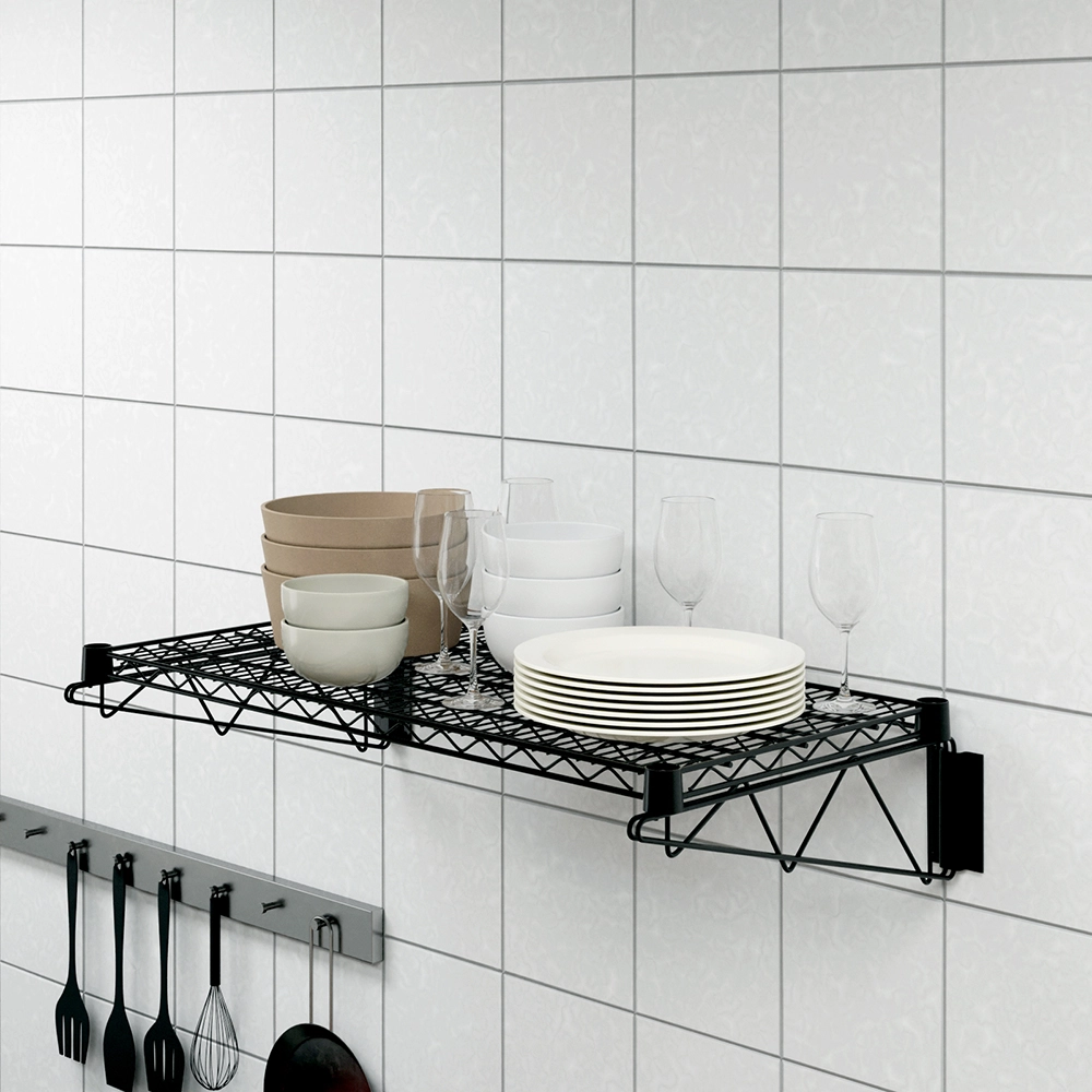 This wall-mounted shelf includes sturdy brackets for secure installation, providing reliable support and stability. It is perfect for storing kitchen essentials, cookware, cleaning supplies, tools, or decorative items. Its sleek black finish adds a modern, professional touch to any space.