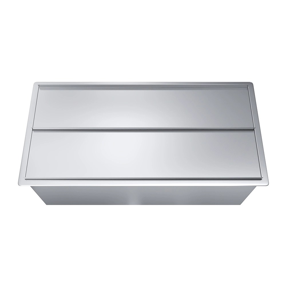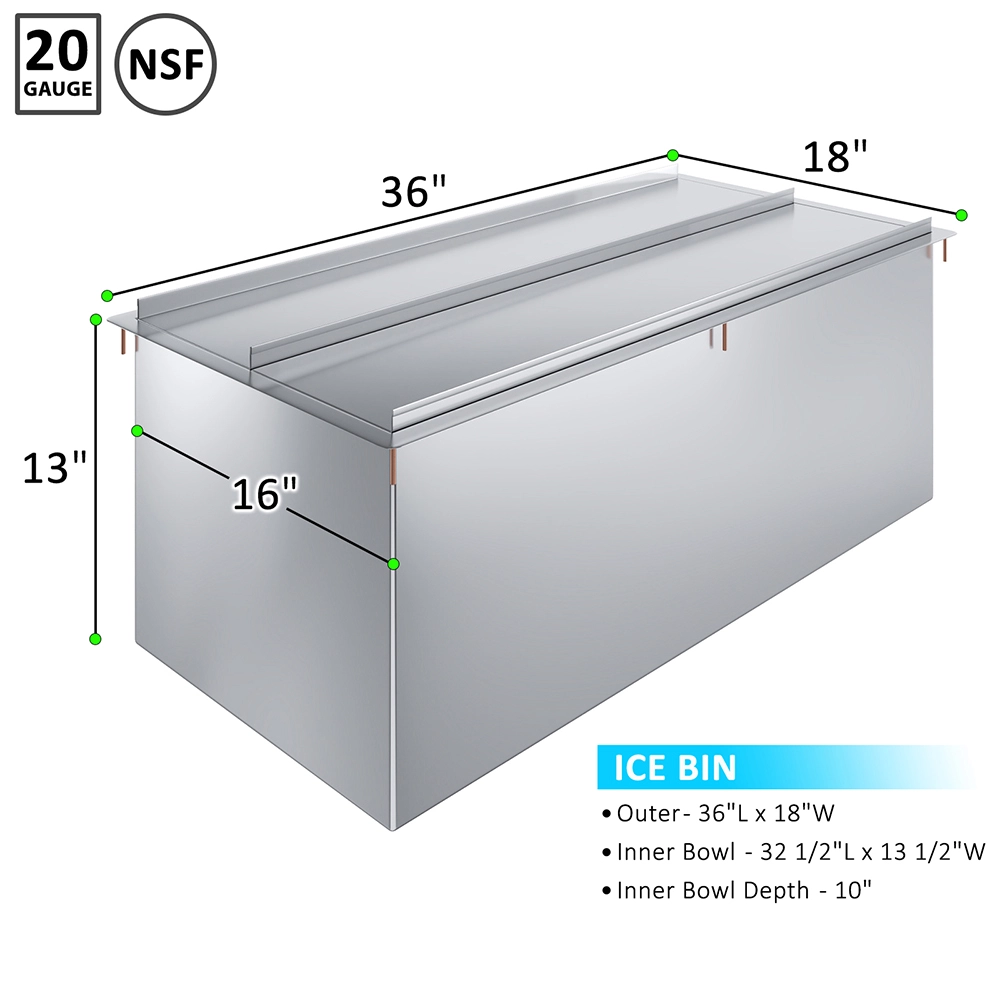 This drop-in ice bin is designed to fit seamlessly into countertops, creating a clean and efficient workspace while maximizing available space. Measuring 18 inches by 36 inches, it provides ample capacity for storing ice, making it ideal for high-volume service areas. The compact design ensures that it integrates smoothly into a variety of setups without compromising functionality.