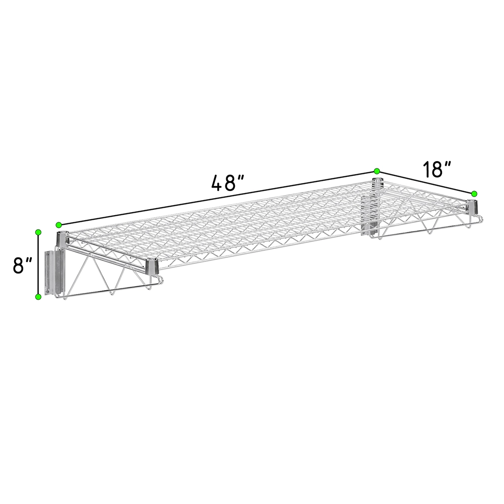 The 18 in. x 48 in. Chrome Wall Mount Wire Shelf With Brackets is a stylish and practical storage solution, ideal for both residential and commercial spaces. Constructed from heavy-duty steel and finished with a high-quality chrome plating, this wire shelf offers superior strength, durability, and resistance to rust and corrosion. Its sleek, reflective surface adds a modern touch to kitchens, pantries, garages, laundry rooms, or retail environments.