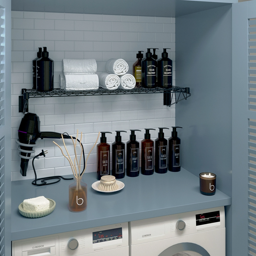 This wall-mounted shelf includes sturdy brackets for secure installation, providing reliable support and stability. It is perfect for storing kitchen essentials, cookware, cleaning supplies, tools, or decorative items. Its sleek black finish adds a modern, professional touch to any space.