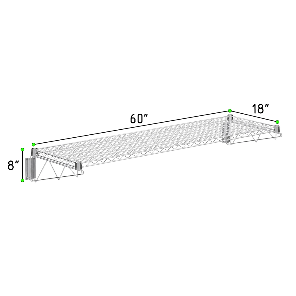 The 18 in. x 60 in. Chrome Wall Mount Wire Shelf With Brackets is a stylish and practical storage solution, ideal for both residential and commercial spaces. Constructed from heavy-duty steel and finished with a high-quality chrome plating, this wire shelf offers superior strength, durability, and resistance to rust and corrosion. Its sleek, reflective surface adds a modern touch to kitchens, pantries, garages, laundry rooms, or retail environments.