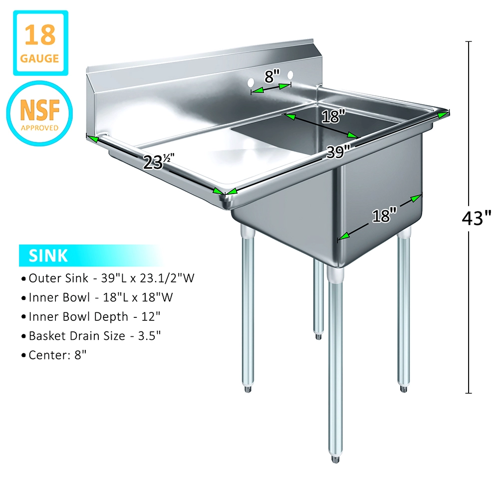Introducing the 18″ X 18″ X 12″ One Compartment Stainless Steel Commercial Prep & Utility Sink with 18” Left Drainboard – the ideal solution for enhancing efficiency and organization in any commercial kitchen or utility workspace. Expertly crafted from 18GA/304 stainless steel, this sink is built to withstand the rigors of daily use, providing exceptional durability, corrosion resistance, and easy maintenance. Its sleek, polished finish ensures a professional look that complements any setting.