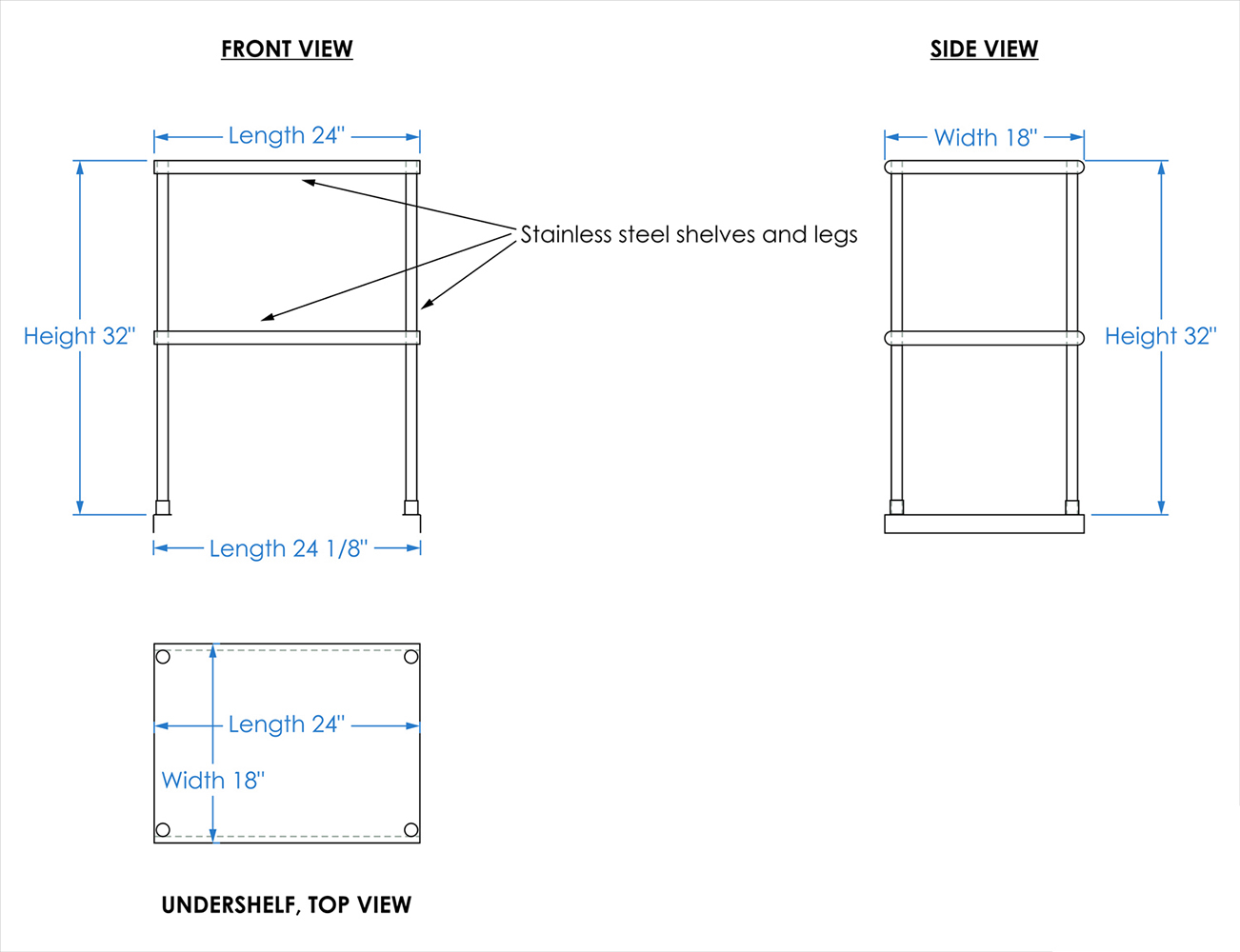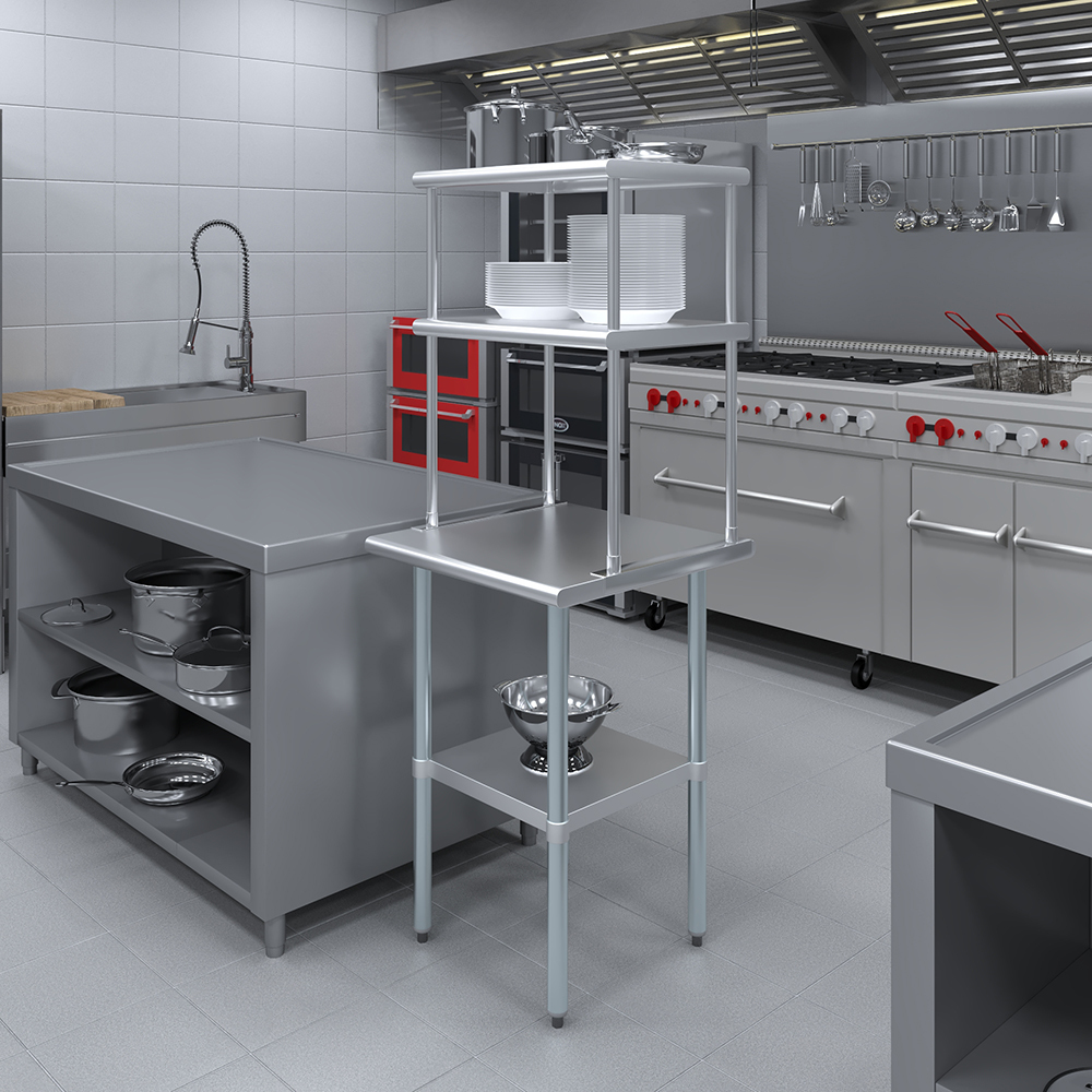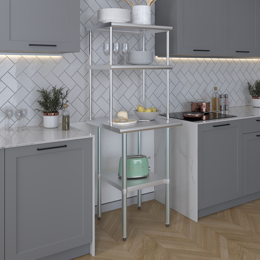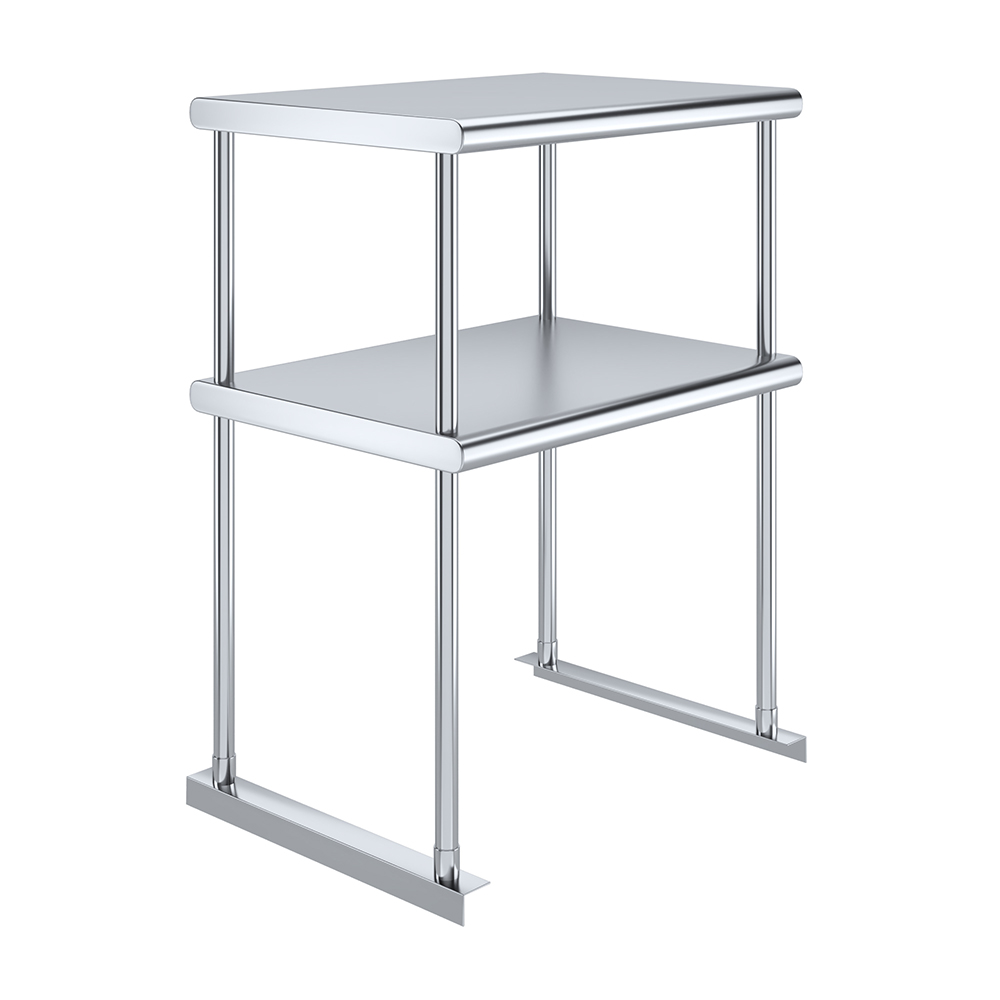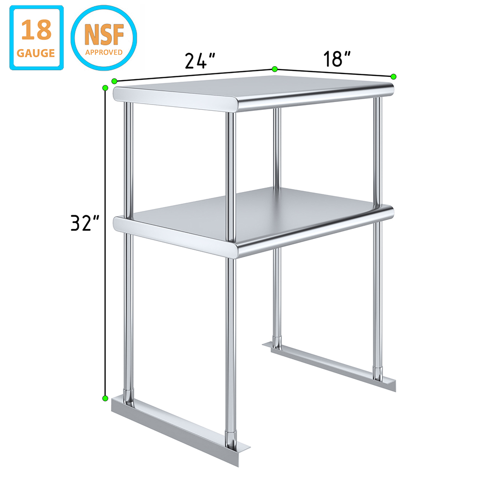 Measuring 18 inches in width and 24 inches in length, this compact yet spacious shelf offers ample storage space across two tiers. The double-tier design maximizes vertical storage capacity, making it ideal for organizing a variety of kitchen essentials, including utensils, ingredients, cookware, and equipment. The open-shelf design allows for easy access and quick retrieval of items, streamlining your workflow and improving productivity.