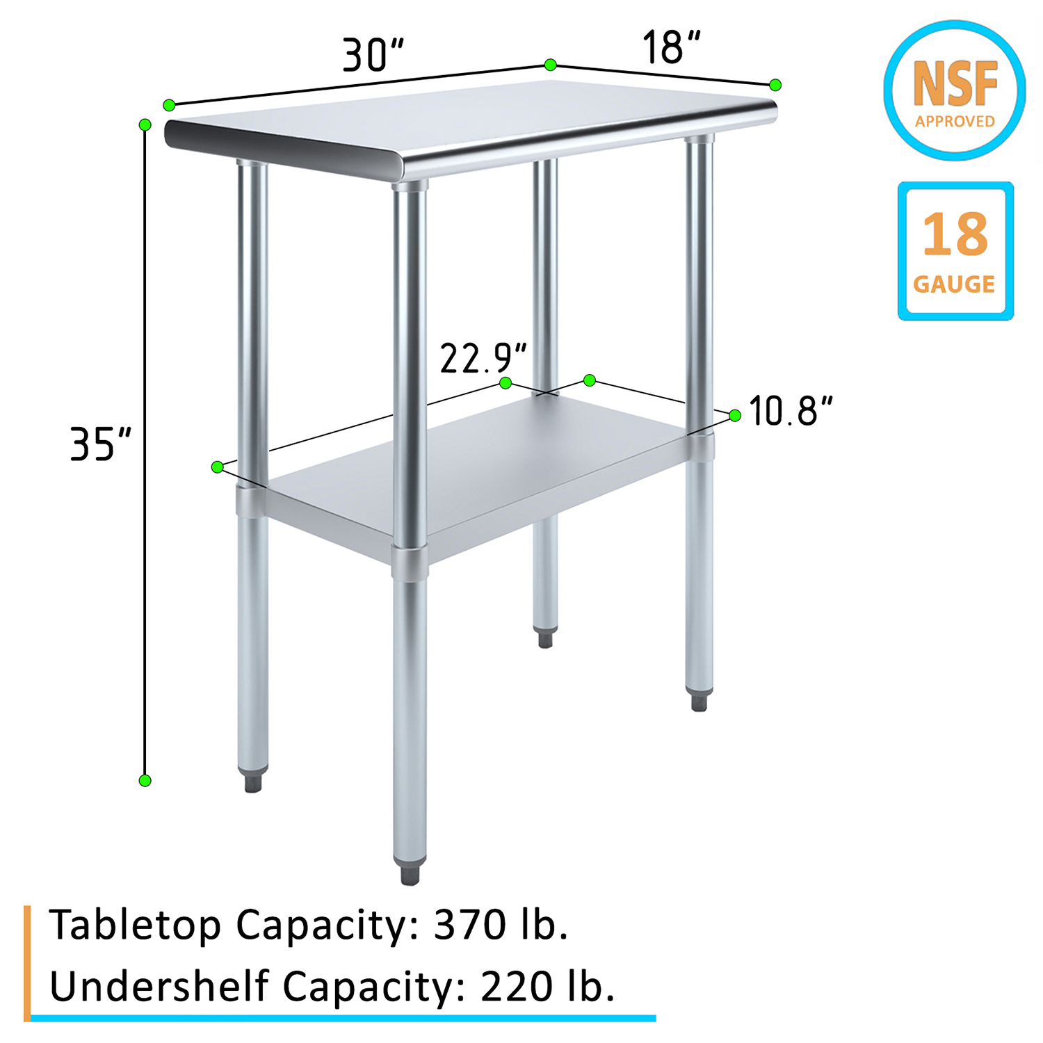 The spacious 18″ x 30″ tabletop provides ample workspace for a variety of tasks, including food preparation, equipment handling, and general workspace organization. Its smooth, polished surface is easy to clean and maintain, ensuring a hygienic environment that meets the high standards of any commercial setting.