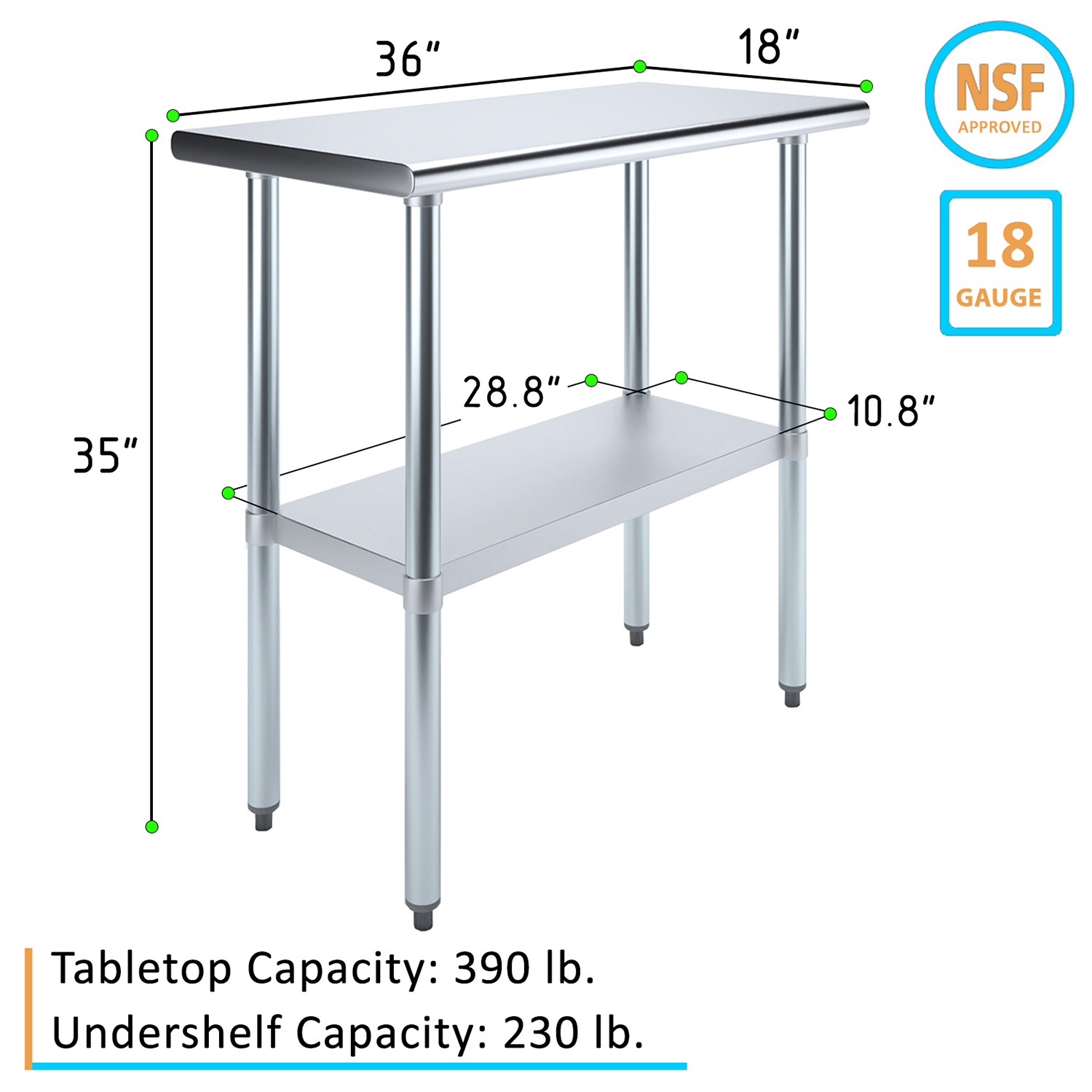 The spacious 18″ x 36″ tabletop provides ample workspace for a variety of tasks, including food preparation, equipment handling, and general workspace organization. Its smooth, polished surface is easy to clean and maintain, ensuring a hygienic environment that meets the high standards of any commercial setting.