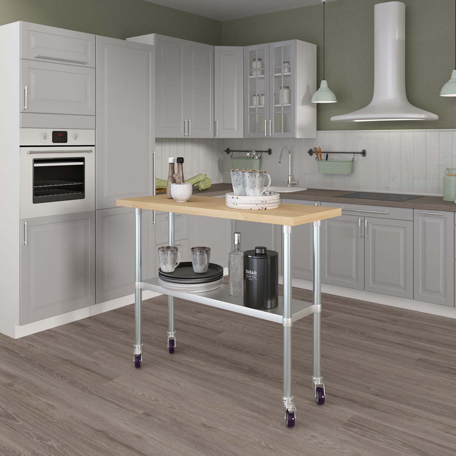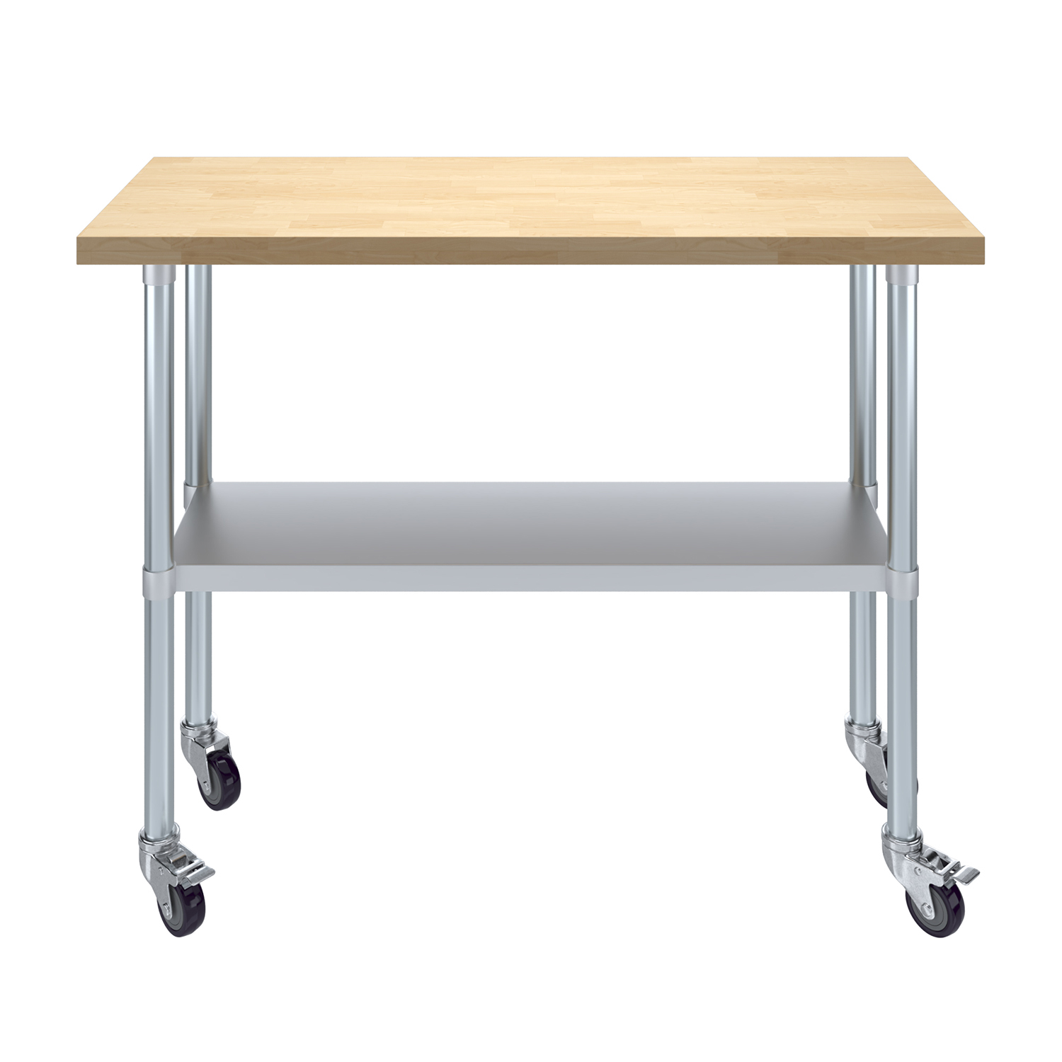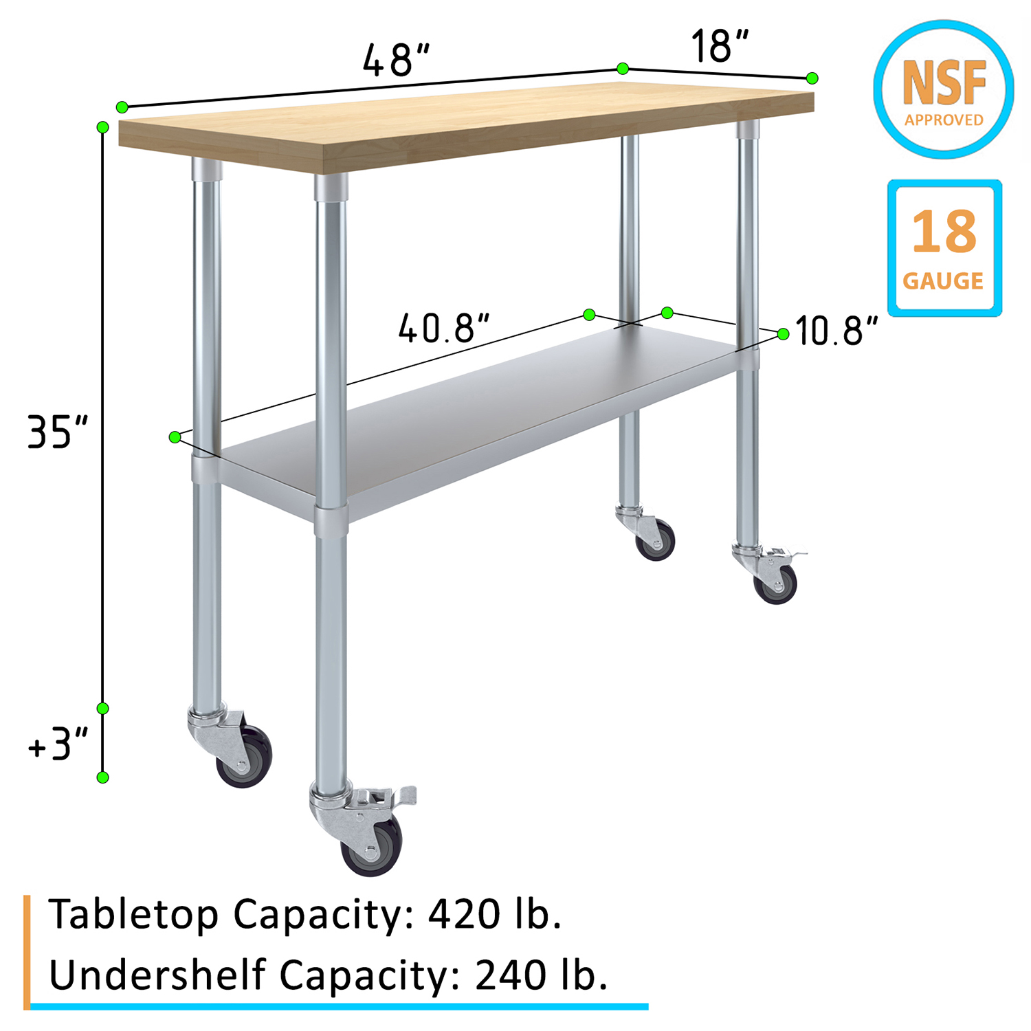 Ideal for both residential and commercial applications, our 18″ x 48″ Maple Wood Top Work Table with Adjustable Undershelf and Wheels is a perfect addition to any workspace. Enhance your kitchen, workshop, or commercial environment with this stylish and practical work table, and experience the benefits of improved organization, efficiency, and mobility. Invest in a quality, versatile work table designed to meet the highest standards of professional use and transform your workspace today.