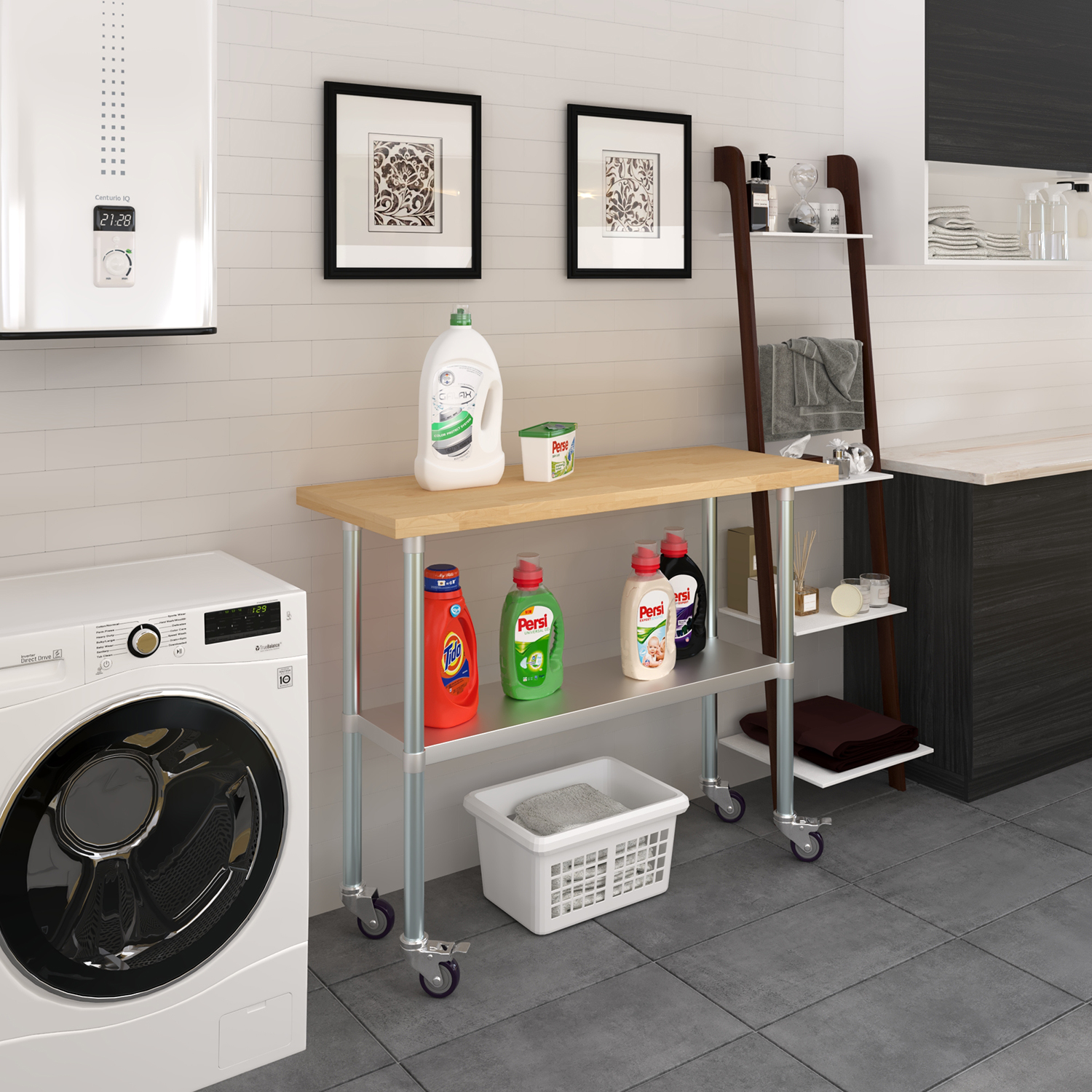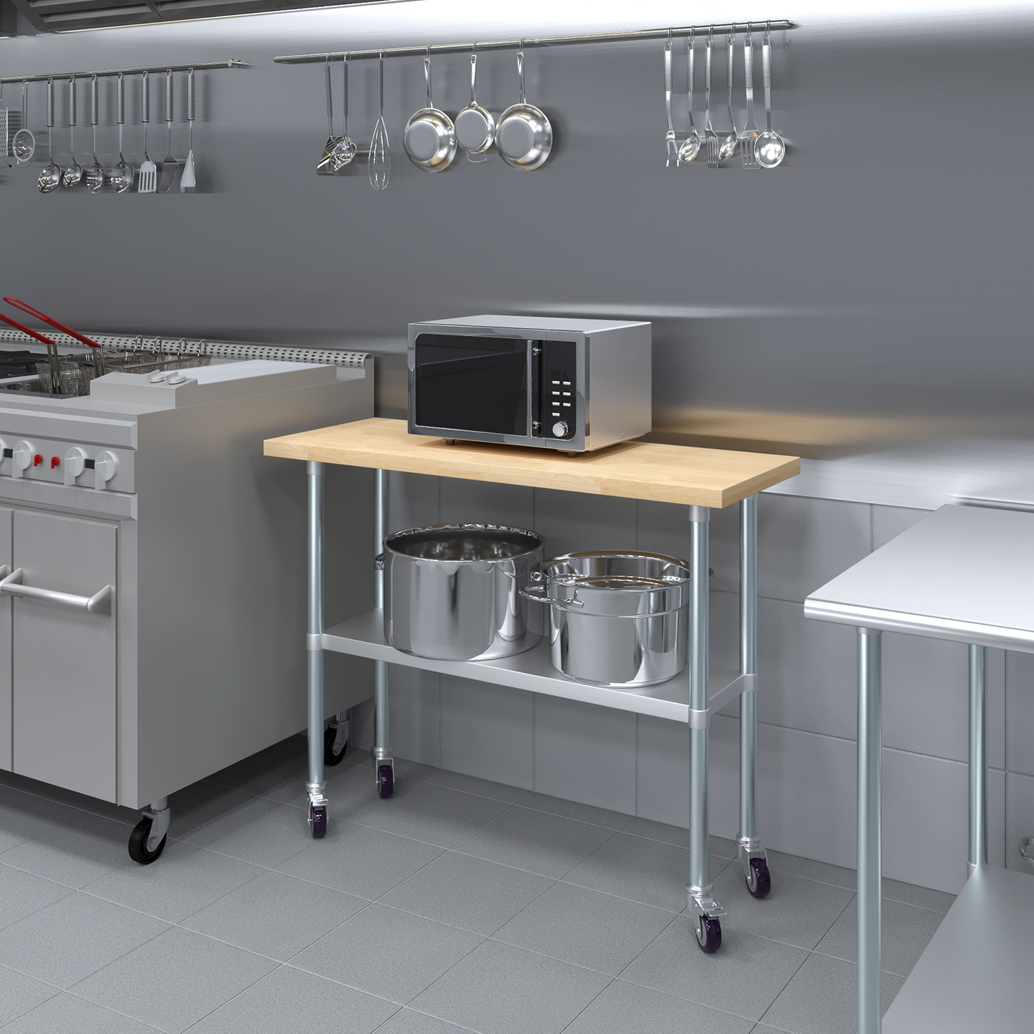The table is designed for easy assembly, with all necessary hardware and clear instructions included. Its sturdy construction ensures that it can handle heavy loads and rigorous use, providing a reliable and durable workspace that stands up to the demands of any professional setting. The easy-to-clean maple wood top and stainless steel undershelf make maintenance simple, promoting a hygienic environment in areas where cleanliness is paramount.