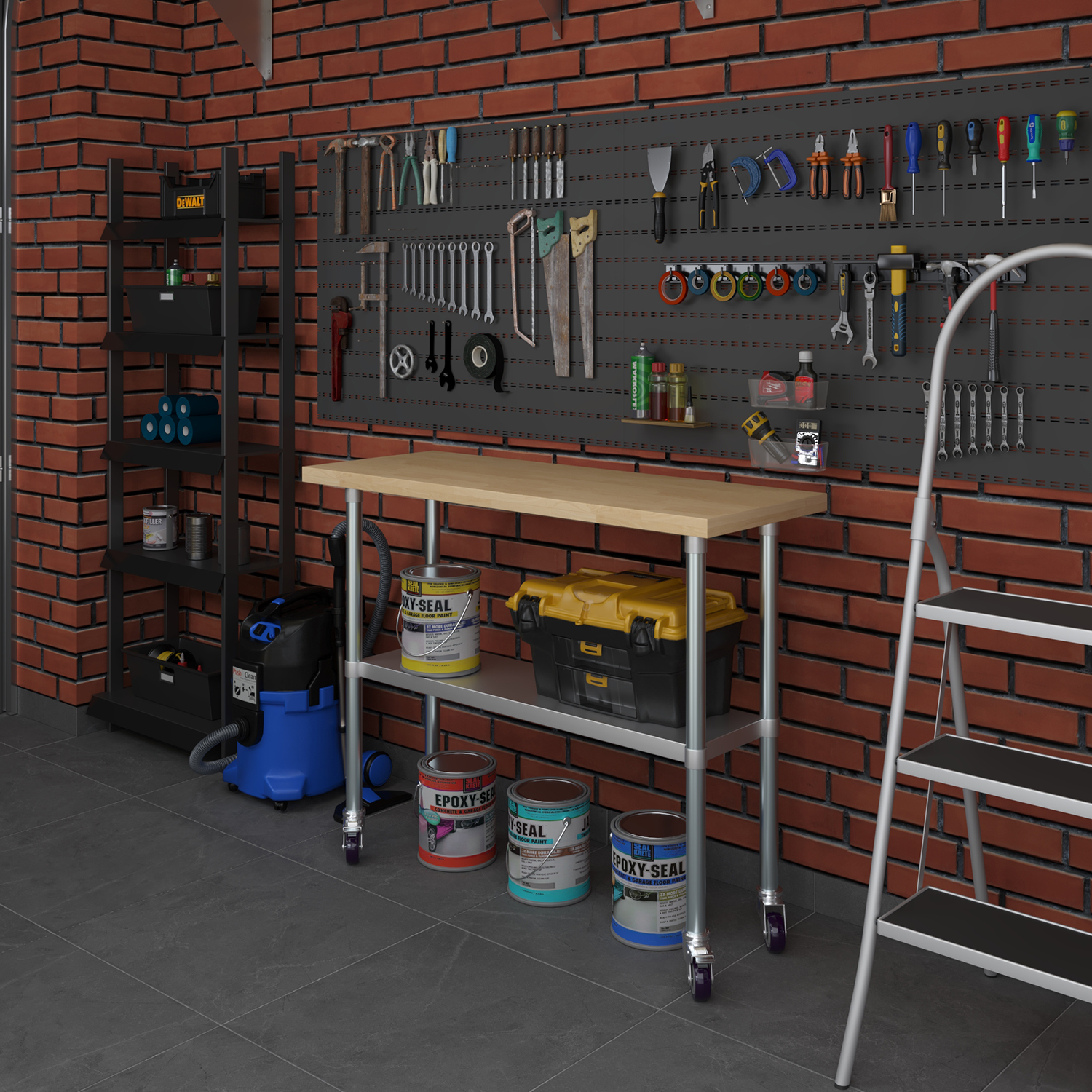 Introducing our 18″ x 48″ Maple Wood Top Work Table with Adjustable Undershelf and Wheels (set of 4), a perfect combination of durability, functionality, and mobility designed to meet the needs of dynamic work environments. This versatile work table features a qualty maple wood top that provides a smooth and sturdy surface, ideal for various tasks such as food preparation, crafting, and assembly work. The natural maple wood not only ensures longevity but also adds a touch of elegance to any setting.