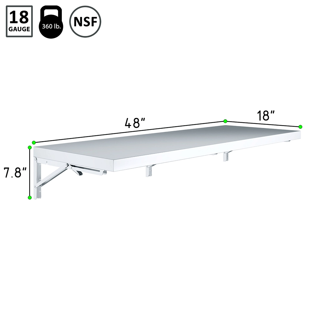 Introducing our 18″ x 48″ Stainless Steel Folding Wall Shelf, an innovative solution for maximizing space and organization in your kitchen, garage, or workspace. This quality shelf is meticulously crafted from 18GA/430 stainless steel, ensuring exceptional durability and resistance, making it ideal for both indoor and outdoor use. The sleek, modern design seamlessly integrates into any setting, adding both functionality and aesthetic appeal.