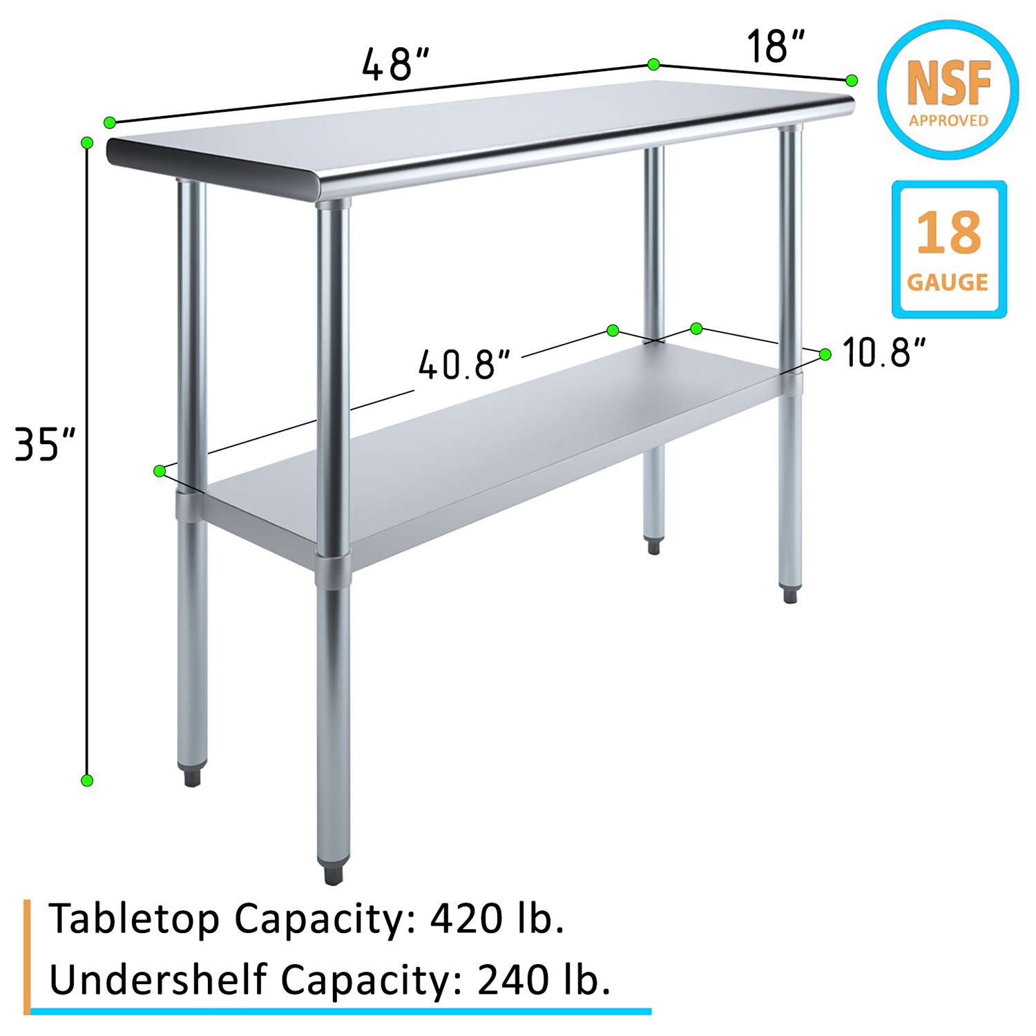 The spacious 18″ x 48″ tabletop provides ample workspace for a variety of tasks, including food preparation, equipment handling, and general workspace organization. Its smooth, polished surface is easy to clean and maintain, ensuring a hygienic environment that meets the high standards of any commercial setting.