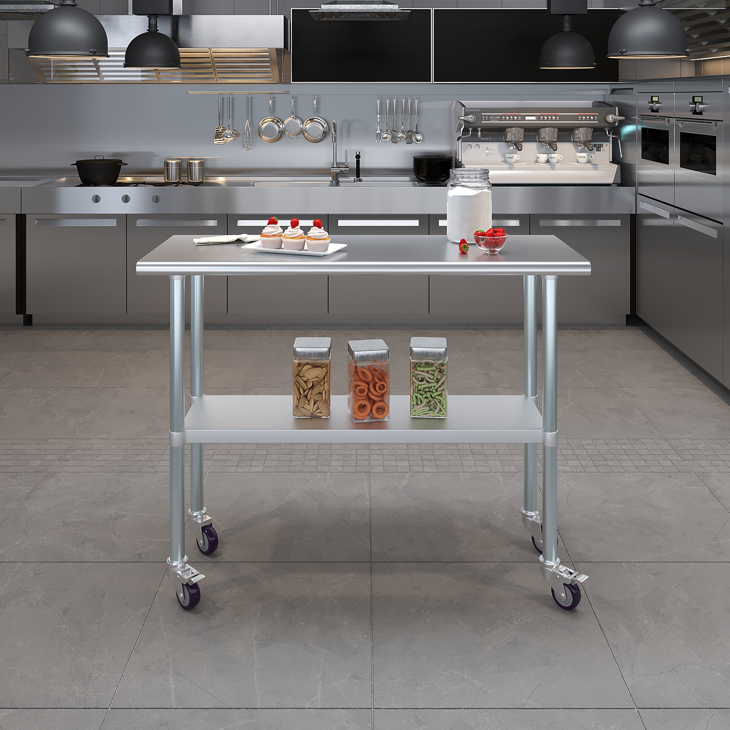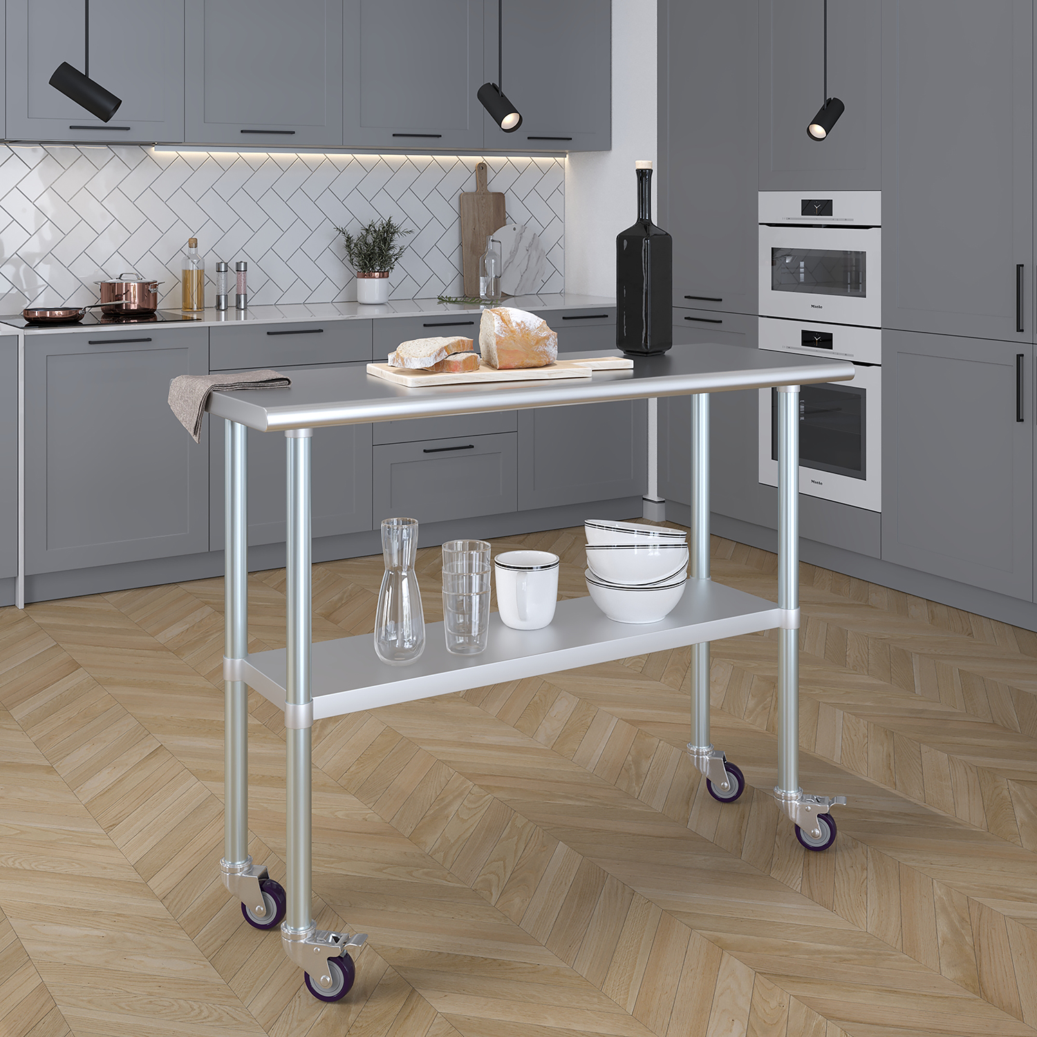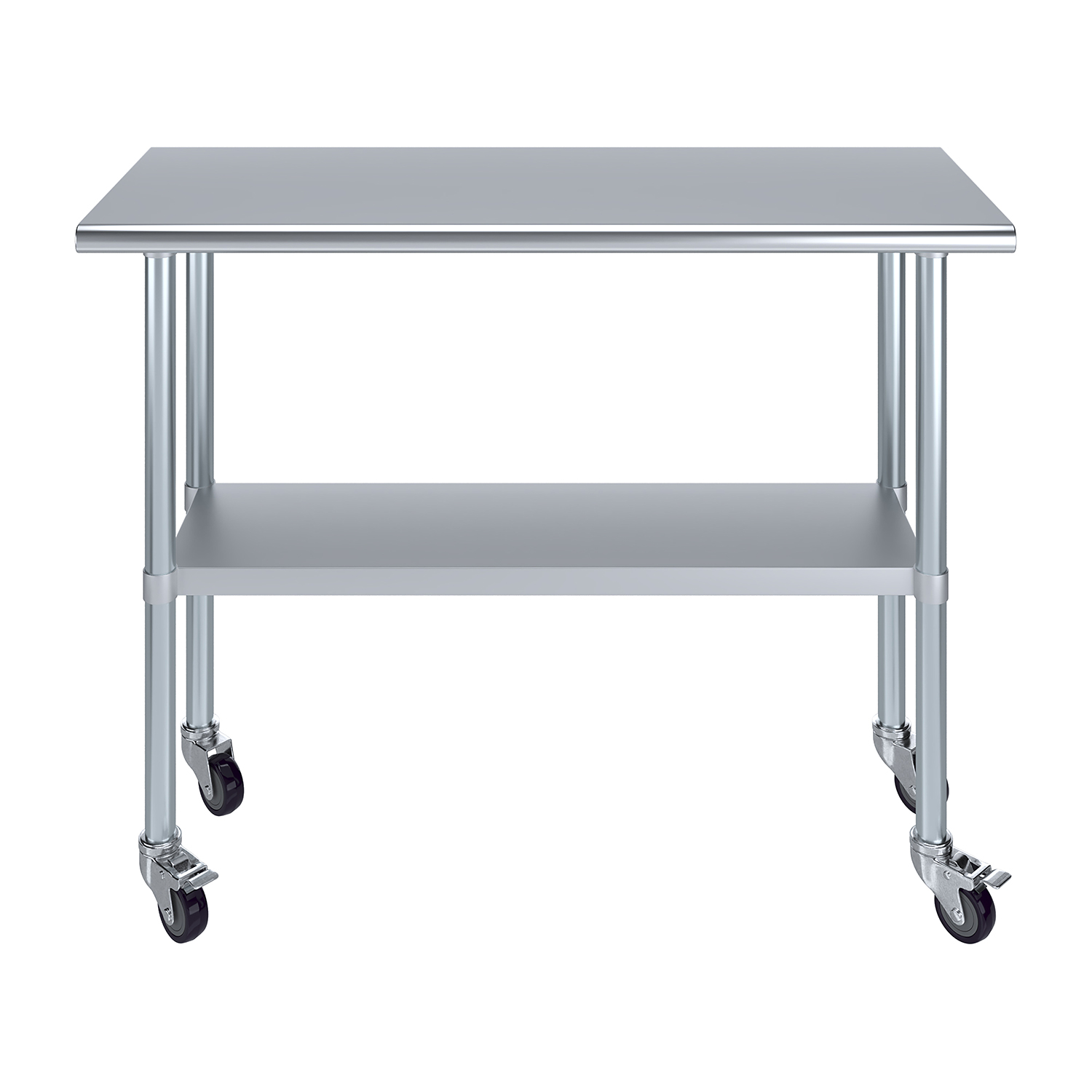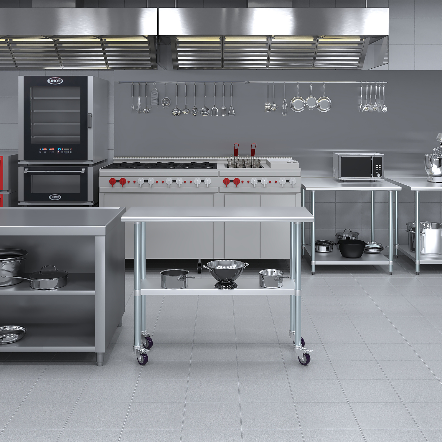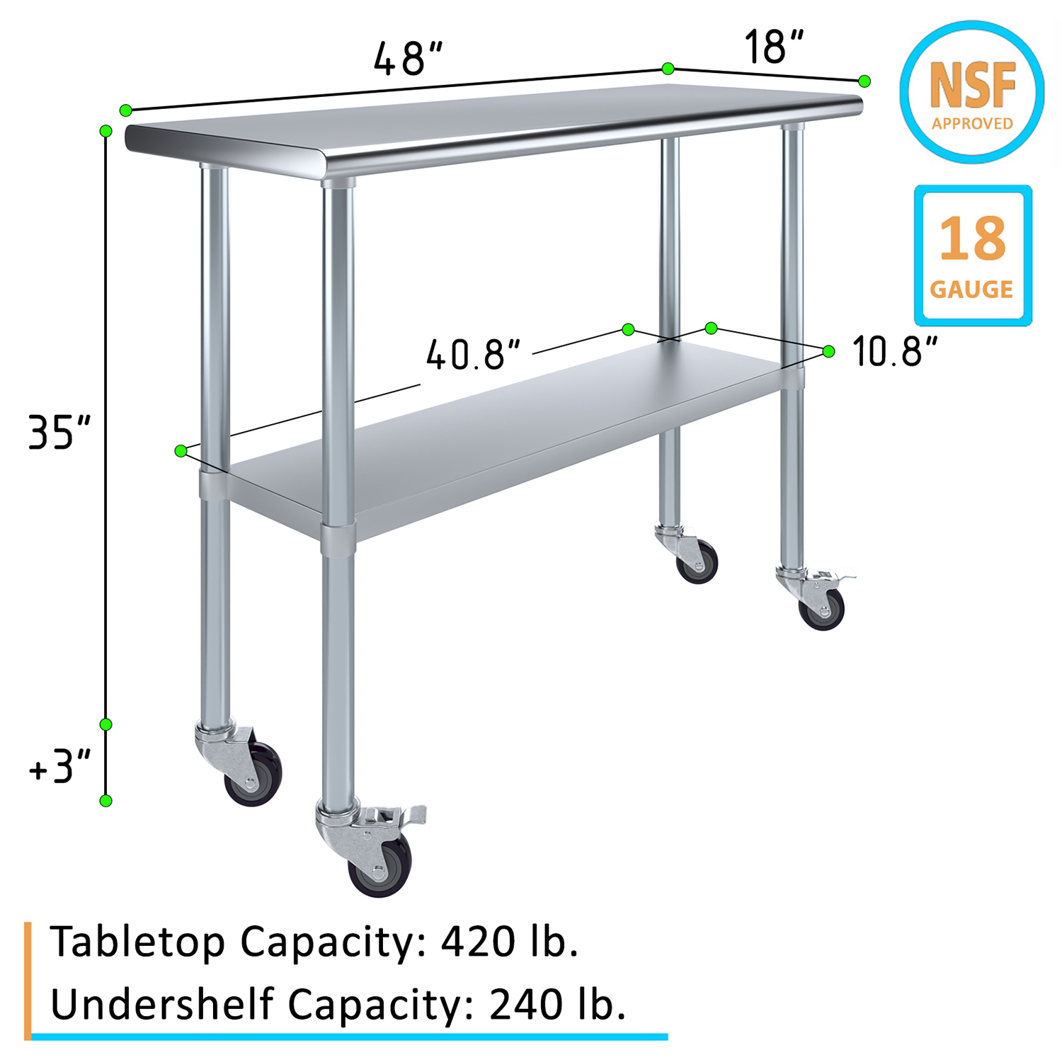 Optimize your workspace with the 18″ x 48″ Stainless Steel Work Table featuring an undershelf and a set of four wheels for enhanced mobility and storage. This work table is constructed from 18GA/430 stainless steel, ensuring a durable, easy-to-clean surface. Designed for demanding environments such as commercial kitchens, laboratories, and workshops, this table guarantees long-lasting performance and reliability.